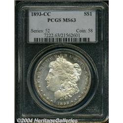 <B>1893-CC<S$1> MS63 PCGS.</B></I> Golden-russet and gunmetal-blue colors lightly surround the border areas of this extremely bright specimen. In fact, the surfaces display pronounced reflectivity, just slightly short of a "prooflike" designation. A few small marks are seen on the obverse, and the central regions are typically weakly struck, the two grade-limiting factors. Certainly a worthwhile, Select example worthy of a close look and a strong bid. <BR><BR><B>Important notice:</B> Heritage usually auctions material at the rate of 200-250 lots per hour. On some occasions eBay Live bid software or the Internet may not be able to keep up with the pace of the auction. We recommend placing a realistic absentee bid now as insurance to avoid disappointment. Occasionally the auctioneer may eliminate or reject an eBay Live bid, and the auctioneer may also reopen a lot after the close of the eBay live bidding (usually because we missed an audience bid), and may reject your bid even if it shows you as the winning bidder. By bidding via eBay Live, you agree that Heritage may award the lot to another bidder at its sole discretion under the circumstances described above or any other reasonable circumstances. Since eBay bids are not shown to us until we open the lot on the floor, we treat those bids just like floor bids. In most cases the floor responds before the eBay bid is presented to us, due to Internet lag time, so for consistency we have made it a policy that floor bids are always considered first over tie eBay live bids. Also please note that all Heritage lots purchased through eBay Live carry a 20% Buyer's Premium. Please make sure you read the Terms and Conditions before you bid. </span></font></tr></table></td></tr></table>
