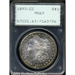 <B>1893-CC<S$1> MS63 PCGS.</B></I> Remarkably well struck for this issue with near full detail over the ear of Liberty and all the feathers on the eagle's breast present. Rich reddish patina covers much of the obverse, the reverse is essentially brilliant. Both sides exhibit exceptionally lustrous surfaces, there are a few small bag marks that account for the grade. A Select example of this very scarce issue. Housed in an early PCGS holder. <BR><BR><B>Important notice:</B> Heritage usually auctions material at the rate of 200-250 lots per hour. On some occasions eBay Live bid software or the Internet may not be able to keep up with the pace of the auction. We recommend placing a realistic absentee bid now as insurance to avoid disappointment. Occasionally the auctioneer may eliminate or reject an eBay Live bid, and the auctioneer may also reopen a lot after the close of the eBay live bidding (usually because we missed an audience bid), and may reject your bid even if it shows you as the winning bidder. By bidding via eBay Live, you agree that Heritage may award the lot to another bidder at its sole discretion under the circumstances described above or any other reasonable circumstances. Since eBay bids are not shown to us until we open the lot on the floor, we treat those bids just like floor bids. In most cases the floor responds before the eBay bid is presented to us, due to Internet lag time, so for consistency we have made it a policy that floor bids are always considered first over tie eBay live bids. Also please note that all Heritage lots purchased through eBay Live carry a 20% Buyer's Premium. Please make sure you read the Terms and Conditions before you bid. </span></font></tr></table></td></tr></table>