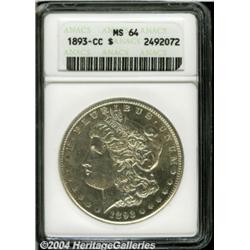 <B>1893-CC<S$1> MS64 ANACS.</B></I> One of the boldly struck Mint State '93-CC Dollars, a final year Carson City issue that comes either poorly defined or with strong definition over Liberty's ear and on the eagle's breast. The surfaces are basically untoned and have a uniform cartwheel sheen that varies little from fields to devices. <BR><BR><B>Important notice:</B> Heritage usually auctions material at the rate of 200-250 lots per hour. On some occasions eBay Live bid software or the Internet may not be able to keep up with the pace of the auction. We recommend placing a realistic absentee bid now as insurance to avoid disappointment. Occasionally the auctioneer may eliminate or reject an eBay Live bid, and the auctioneer may also reopen a lot after the close of the eBay live bidding (usually because we missed an audience bid), and may reject your bid even if it shows you as the winning bidder. By bidding via eBay Live, you agree that Heritage may award the lot to another bidder at its sole discretion under the circumstances described above or any other reasonable circumstances. Since eBay bids are not shown to us until we open the lot on the floor, we treat those bids just like floor bids. In most cases the floor responds before the eBay bid is presented to us, due to Internet lag time, so for consistency we have made it a policy that floor bids are always considered first over tie eBay live bids. Also please note that all Heritage lots purchased through eBay Live carry a 20% Buyer's Premium. Please make sure you read the Terms and Conditions before you bid. </span></font></tr></table></td></tr></table>