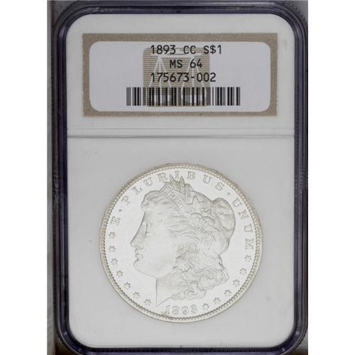 <B>1893-CC<img border='0' src='http://www.heritagecoins.com/images/star.gif' width=10 height=10>$1> MS64 NGC.</B></I> An exceptionally well defined example of this key Carson City issue, of which only 677,000 pieces were struck. The mint luster is notable on this scarce MS64 coin and only the slightest abrasions prevent a full Gem grade.