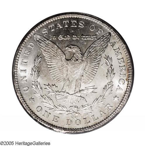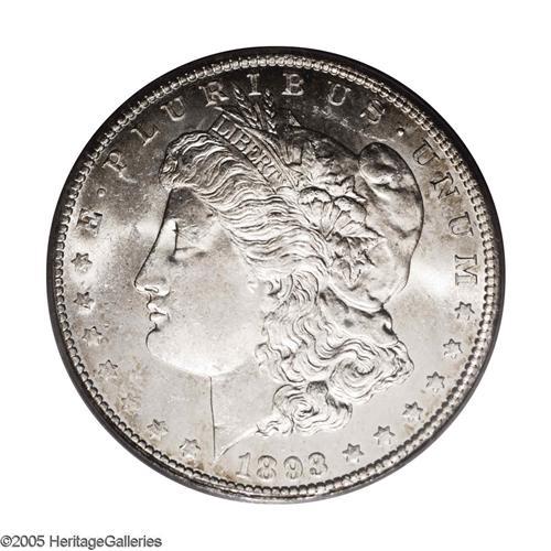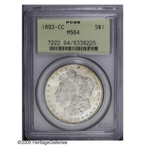 <B>1893-CC<S$1> MS64 PCGS.</B></I> Both sides exude thick cartwheel mint frost and the striking details are nearly complete on each side, something that is certainly not taken for granted on an 1893-CC. Minimally abraded, the surfaces show only the slightest marks and luster grazes that keep the coin from the Gem category. Most of the nicks seem to be located in the left obverse field, the largest open area in the design which is most likely to receive contact. Generally untoned throughout, there are accents of copper-golden patina visible at the border areas. An exceptional, high-end MS64 example of this key issue and sure to be of interest to a wide range of bidders. The Carson City mint was closed down by President Grover Cleveland who returned to office in 1893, as felt that Mint was not needed with the San Francisco Mint geographically close by. Cleveland had also closed down the Carson City Mint in 1885 when he first came to office, but upon being turned out in 1889, the Carson City mint was reopened by political friends. This particular coin is a delightful reminder of those simpler days.