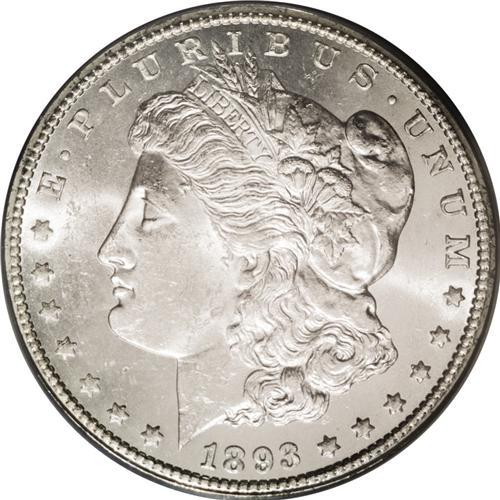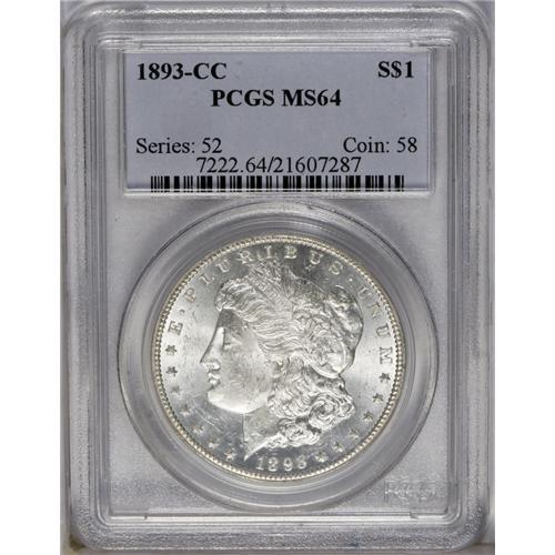 <B>1893-CC<img border='0' src='http://www.heritagecoins.com/images/star.gif' width=10 height=10>$1> MS64 PCGS.</B></I> Mounting political opposition to the silver lobby finally forced the Federal government to permanently suspend coinage at the Carson City Mint in 1893. Before the presses went idle, however, 677,000 silver dollars were produced. Although not as scarce as its 1889 counterpart, this CC-mint silver dollar is, nonetheless, quite difficult to locate in the preferred levels of Mint State.<BR> Each side portrays a snow-white, completely untoned appearance and an unusually bold strike for this often-weak date. The fields are exceptionally smooth with a few minor scuffs visible on Liberty's cheek. This exceptional example will easily fit in any high grade Uncirculated dollar collection.<BR><I>From The Chicago-Ark Collection.</B></I>