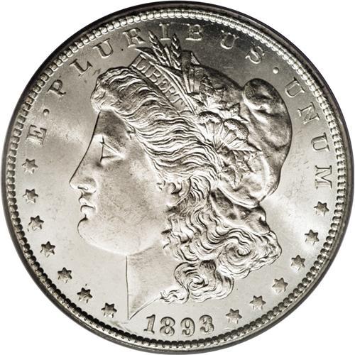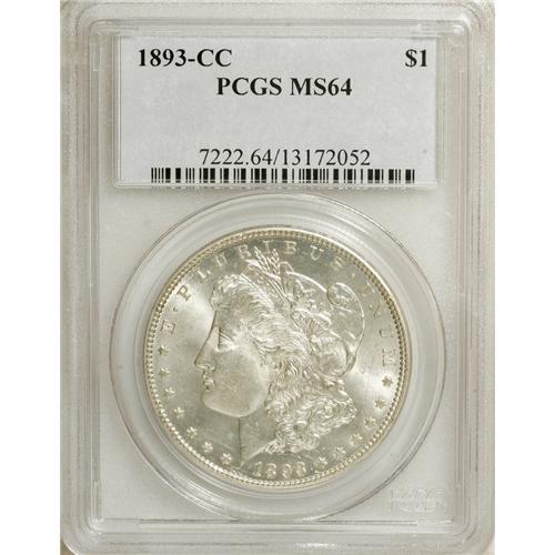 <B>1893-CC S$1 MS64 PCGS.</B></I> The 1893-CC Morgan dollar is a collector's favorite because of its scarcity and its position as the last Carson City Mint coin of its denomination. The issue does not come without its problems, however. In his <I>Silver Dollars and Trade Dollars of the United States,</B></I> David Bowers says: "Of all Carson City Mint Morgan dollars, the 1893-CC is notorious for being very heavily bagmarked. The vast majority of Mint State coins are in lower levels and have extensive marking. High-grade mark-free coins are very rare."<BR> Radiant luster exudes from the well preserved, essentially untoned surfaces of this near-Gem specimen. A few inoffensive luster grazes just barely preclude full Gem status, and a strong impression left relatively sharp detail in the hair over Liberty's ear and on the breast feathers. Light die cracks encircle the margins on both obverse and reverse.<BR><BR><b>Shipping:</b> Coins & Currency (<a target="_blank" href="http://www.heritageauctions.com/common/shipping.php">view shipping information</a>)