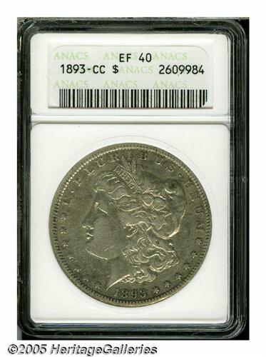 <B>1893-CC<S$1> XF40 ANACS.</B></I> This CC issue has silver-gray surfaces that display touches of light brown patina, especially around the peripheries. Liberty's hair over the forehead and ear is weakly defined, as are the eagle's breast feathers. Some moderate abrasions are noted on Liberty's cheek, and a couple of as-struck planchet voids are seen on the eagle's midsection.