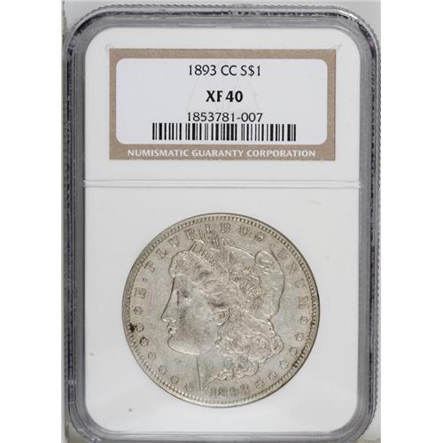 <B>1893-CC S$1 XF40 NGC.</B></I> The pearl-gray surfaces retain hints of reflectivity, impressive given the amount of wear. The usual marks are present, and a spot of dark toning appears just below 9 o'clock near the obverse rim.<BR><BR><b>Shipping:</b> Coin/Currency (<a target="_blank" href="http://www.heritageauctions.com/common/shipping.php">view shipping information</a>)