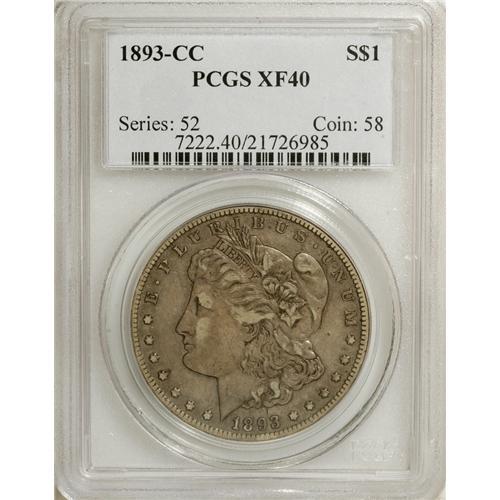<B>1893-CC S$1 XF40 PCGS.</B></I> This important issue had a mintage of 677,000 pieces, and according to David Bowers (2006), " ... is 3rd in rarity among Carson City Morgan silver dollars, after 1889-CC (rarest) and 1879-CC." He also notes that: " ... several hundred thousand (were melted) under the 1918 Pittman Act." This XF specimen displays relatively uniform medium gray toning, and retains sharp detail for the grade. A few minor marks are not distracting. Overall, quite a pleasing lightly circulated Morgan.<BR><BR><b>Shipping:</b> Coins & Currency (<a target="_blank" href="http://www.heritageauctions.com/common/shipping.php">view shipping information</a>)