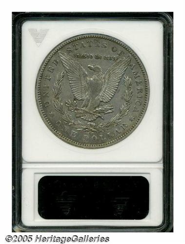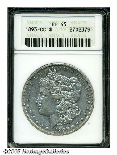 <B>1893-CC<S$1> XF45 ANACS.</B></I> This CC dollar displays bright silvery surfaces on the obverse, that are joined by faint dappled gray-blue patination on the reverse. The design elements exhibit good residual detail, though the hair above Liberty's ear and the eagle's breast are weak. Small contact marks are scattered throughout the obverse, being especially noticeable on Liberty's cheek. Always a collectors' favorite due to its scarcity and its being the last Carson City coin of its denomination.