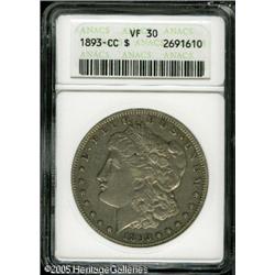 <B>1893-CC<img border='0' src='http://www.heritagecoins.com/images/star.gif' width=10 height=10>$1 VF30 ANACS.</B></I> This CC issue is light gray, and shows a few small marks scattered about. Lot:10409