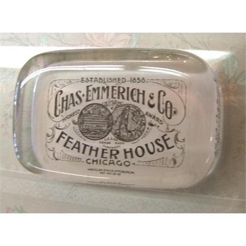 This is a heavy glass paperweight advertising for Chas. Emmerich & Co. Feather House, Chicago. It was made in 1892 to commemorate the 1893 Columbia Expo in Chicago. At least that is what I assume. At the very bottom in small print is American P.W. Co. Pittsburg, Pa. Pat. Nov. 29, 92. It has a few fine scratches on the top which in my opinion doesn't detract from this wonderful piece and otherwise no chips or cracks. A great cross-over collectible for worlds fairs, paperweights and advertising collectors. It is 4" long, 2 1/2" wide and about 1" thick.