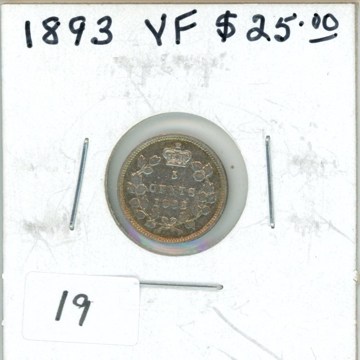 1893 Canadian Victorian Silver 5 Cents. VF-20. Key Date.