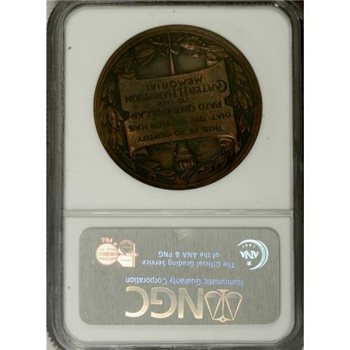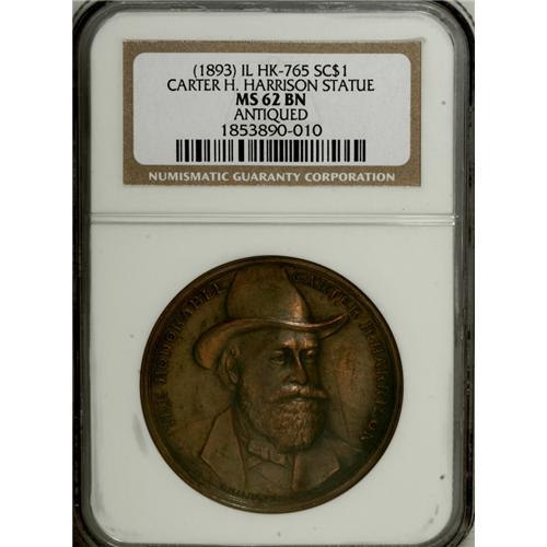 <B>(1893) Carter H. Harrison Statue MS62 Brown Antiqued NGC.</B></I> IL HK-765. Chicago mayor Carter Harrison was assassinated by a rebuffed office seeker in late 1893. This so-called dollar variety was issued to contributors for a Harrison memorial. Maroon, olive-brown, and mahogany toning. Lightly hairlined, and hints of dark build-up are present on the reverse. Census: 3 in 62, 2 finer (12/06).<BR><BR><b>Shipping:</b> Coins & Currency (<a target="_blank" href="http://www.heritageauctions.com/common/shipping.php">view shipping information</a>)