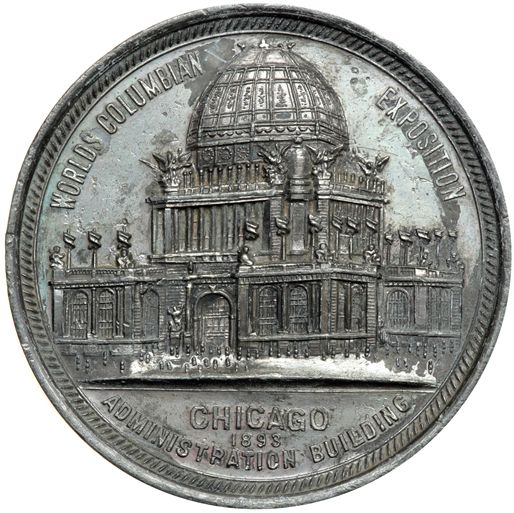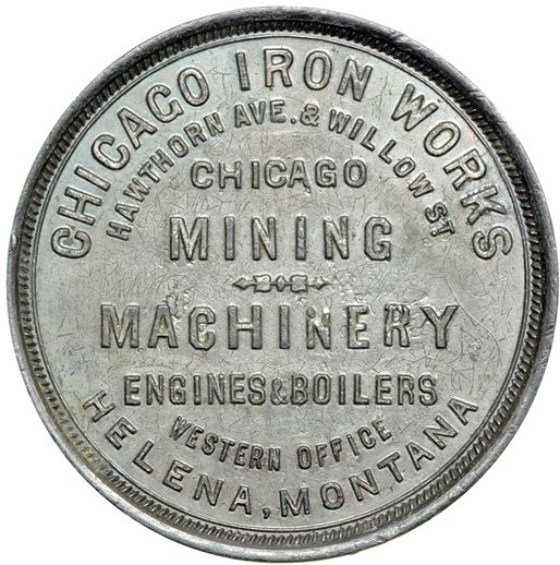 1893 Chicago Iron Works Medal, Eglit-28. Pot metal, 69mm. This medal is unusually well preserved. Most medals produced in pot metal will show significant signs of corrosion and environmental damaged. This medal, with the Administration Building in high relief of the obverse was issued by the Western Office in Helena, Montana. It has a few dark areas of oxidation on the obverse and a light coating of lacqure on the reverse. Our grade MS-62 to MS-63.