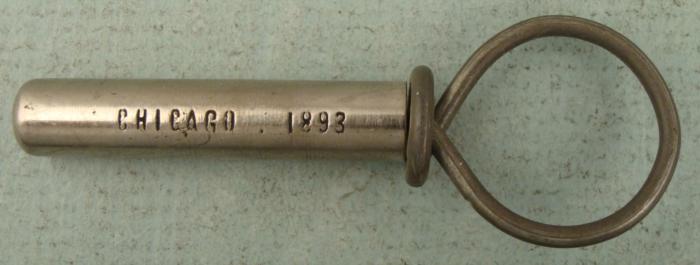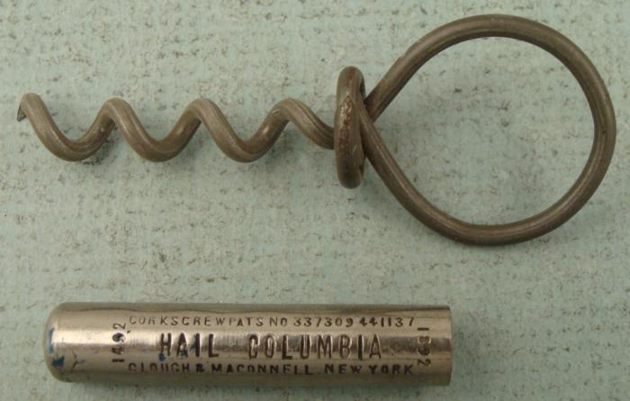 This corkscrew was made as a souvenir of the 1893 Chicago Worlds Fair Columbian Exposition. The screw comes in a sheath engraved with the words "HAIL COLUMBIA," and the dates 1492 and 1892, commemorating the anniversary of Columbus. The other side is marked CHICAGO 1893. It also has the maker name, Clough & Maconnell, New York. Altogether its length is 2 3/4". Its condition is excellent.