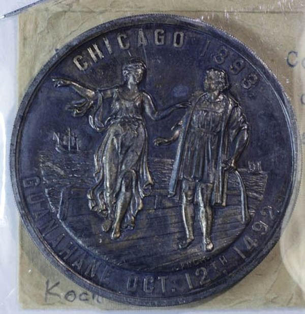 1893 Columbian Expo Medal. Columbus - Guided by Light. Reverse, Santa Maria. White Metal. 51 mm. Dies by Koch. AU, deeply patinated.
