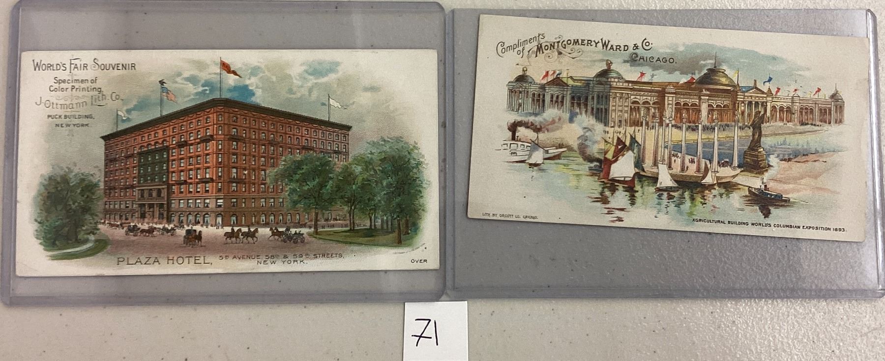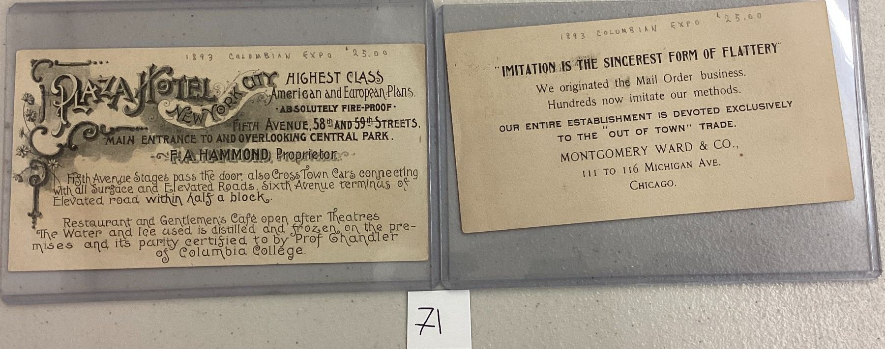 2 1893 trade card Columbian Exposition. New York City Plaza Hotel & Montgomery Ward Co. Early.
