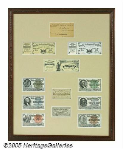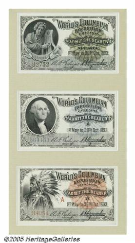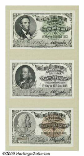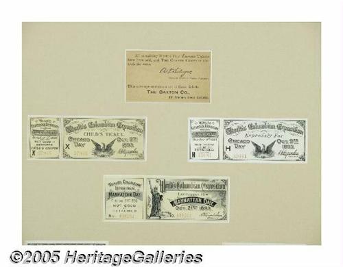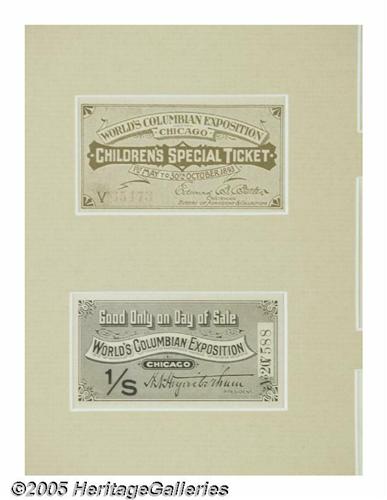 <B>1893 Columbian Exposition Collection Souvenir Tickets</B></I> Held May 1, until October 30, 1893 at a 1.3 mile strip of Jackson Park in Chicago, the Columbian Expo celebrated the 400th anniversary of the discovery of America by Christopher Columbus. An estimated 27 million people attended during the six-month run. This lot contains a matted and framed set of eleven original tickets. Included are tickets for children, Manhattan Day, Chicago Day, Music, Complimentary and others. Many of these are printed by the American Bank Note Company of New York and are extremely high quality with images of Lincoln, Washington, Franklin, Columbus and others. Matted with the tickets is a portion of the envelope they originally came in, issued by The Caxton Company. All are in excellent condition, a handsome display. Lot:254