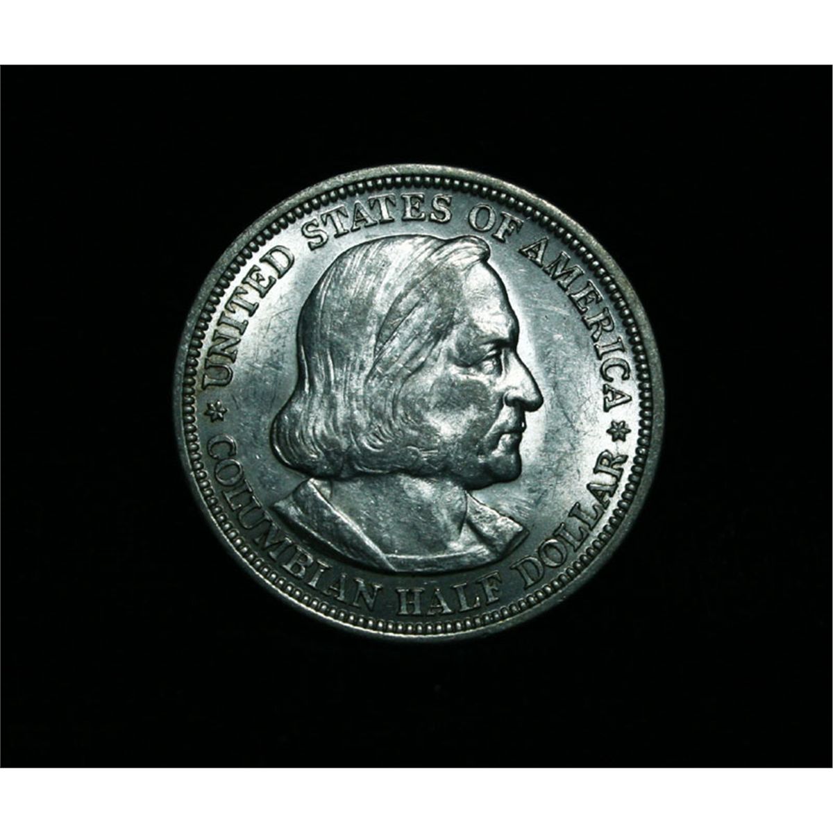 A nice example of this first us Commemorative. Blast White with Nice Luster. The Columbus Half dollar along with the Isabella Quarter were minted in honor of the 400th anniversary of Columbus' voyage to the new world. It was first distributed at the worlds fair honoring that voyage. When examining a Columbian Exposition half dollar The first points to show wear are Columbus’ eyebrow, cheek and the hair behind his forehead and jaw. On the reverse, check the foresail and mainsail, as well as the right side of the Eastern Hemisphere. NGC's Price Guide lists an ms63 at $77 and The Wholesale Greysheet lists ms63 at $60. Estimated Value $70