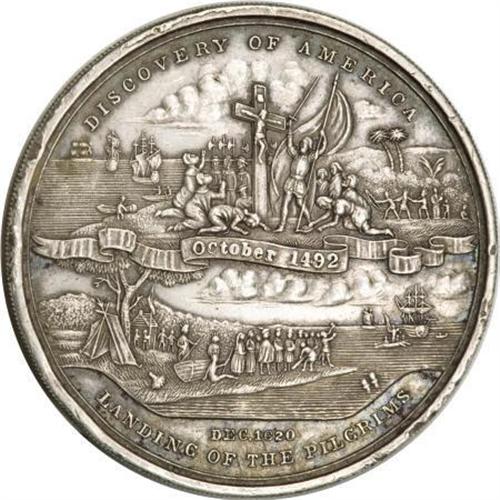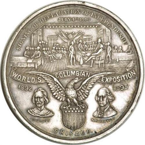 <B>1893 Columbian Exposition Declaration of Independence, HK-156, AU50 Minor Rim Damage Uncertified.</B></I> Silver, "very rare" (HK, 1963). This variety was made by Boldenweck & Co. for the 1893 Columbian Exposition held in Chicago, Illinois. Examples were struck in silver and white metal, with the former rarer. The present piece has slate-gray toning and minimal evidence of handling aside from a few scattered and small rim depressions and nicks.<BR><BR><b>Shipping:</b> Coins & Currency (<a target="_blank" href="http://www.heritageauctions.com/common/shipping.php">view shipping information</a>)