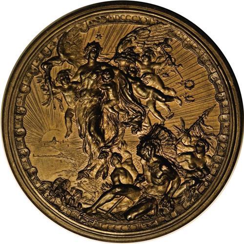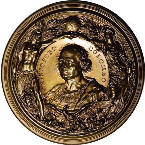 <B>1892 Stefano Johnson, Cristoforo Colomboe Medal AU Uncertified.</B></I> Bronze. Plain edge. 60 mm. Listed only in white metal in Rulau as B8, and unlisted in his reference in bronze <I>Discovering America.</B></I> Obverse: bust of Columbus facing left, Cristoforo Colombo around, all within circular central depression. Indian princess left grasps hand of Europa at right. Above all is the Western Hemisphere with Columbus' first voyage route marked. Spread eagle at the bottom. Reverse: the fruits of Columbus' discoveries, personification of Civilization at center surrounded by genii, and Indian warriors below. At left is a coastline with Washington in distance. The outer rim is made of coats of arms of all the U.S. states and Roman numeral dates 1892 and 1492. This is called one of the most beautiful of all Columbus medals.