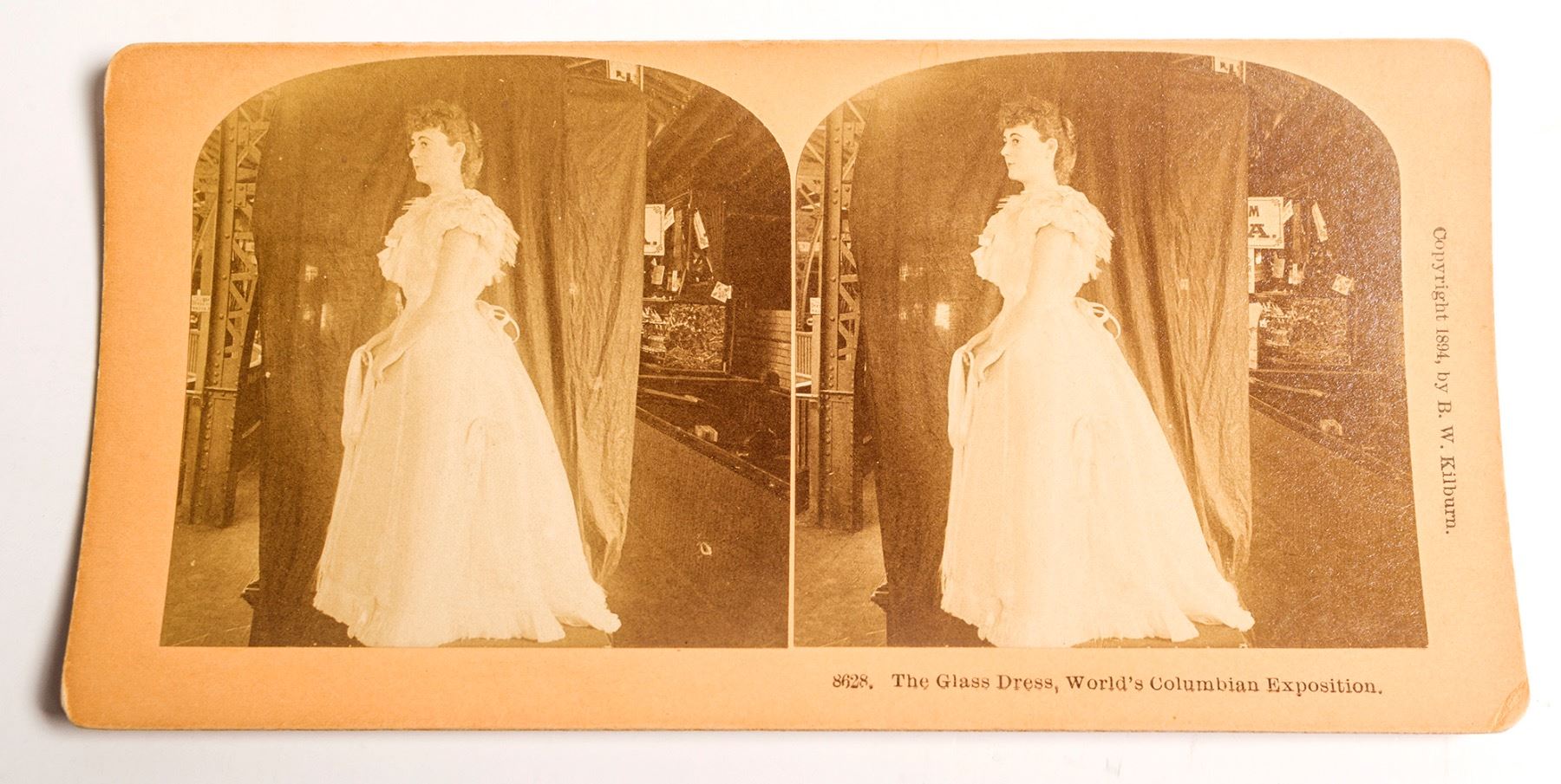 B.W. Kilburn stereoview #8628, The Glass Dress, World's Columbian Exposition. View shows woman posing in white dress made of glass. Medium contrast. This was one of the most popular exhibits at the fair, located in Edward Drummond Libbey's Glass Pavilion. Libbey was the only American glass firm represented. His pavilion even featured live glass making, in addition to a room where everything was made out of glass. A well known actress of the time asked Libbey to make her a glass dress. It was so popular that journalists thought it would become a new fashion trend. It even attracted the attention of visiting Spanish Princess Eulalia who, after seeing this dress, commissioned Libbey to make her one of her own, which he did. The fair was a huge success for Libbey, making his name synonymous with fine glassware. [For more, see a FOHBC article written by Jack Sullivan] (Prag Collection) Date: Location: Chicago, Illinois HWAC # 50653