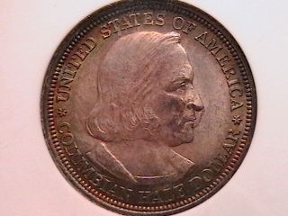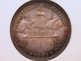 1893 Columbian Half Ch MS64 NGC Rainbow Peripheries . The centers are toned a frosty gray. The peripheries on both sides show a halo of rainbow colors!