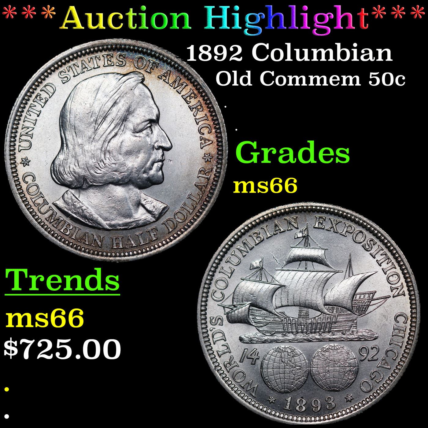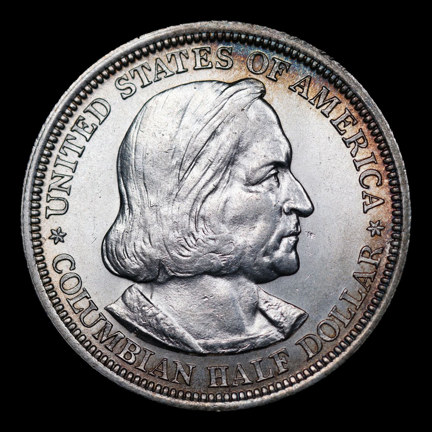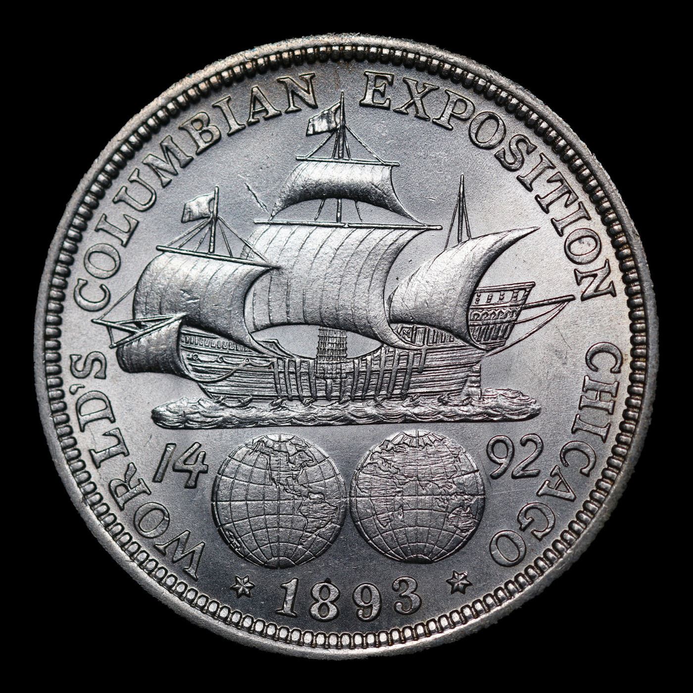 1893 Columbian Old Commem Half Dollar 50c Graded ms65+ By SEGS. The Columbus Half Dollar along with the Isabella Quarter were Minted in Honor of the 400th Anniversary of Columbus' Voyage to the New World. It was First Distributed at the Worlds Fair Honoring that Voyage. When examining a Columbian Exposition Half Dollar, the First Points to Show Wear are Columbus’ Eyebrow, Cheek and the Hair Behind his Forehead and Jaw. On the Reverse, Check the Foresail and Sainsail, as well as the Right Side of the Eastern Hemisphere. A Corey's Pick, Bid to Win Coin