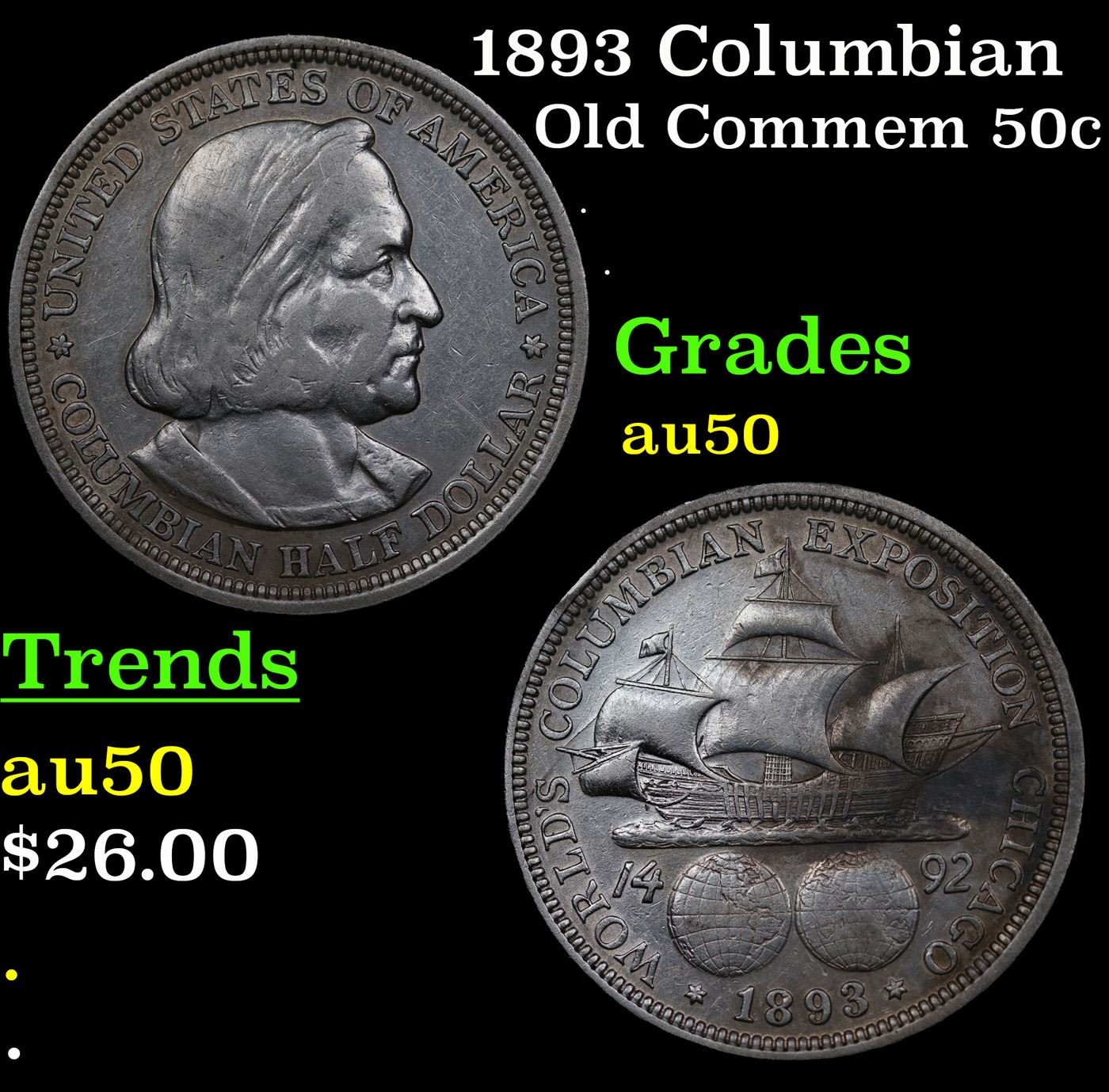 1893 Columbian Old Commem Half Dollar 50c Grades AU, Almost Unc. The Columbus Half Dollar along with the Isabella Quarter were Minted in Honor of the 400th Anniversary of Columbus' Voyage to the New World. It was First Distributed at the Worlds Fair Honoring that Voyage. When examining a Columbian Exposition Half Dollar, the First Points to Show Wear are Columbus’ Eyebrow, Cheek and the Hair Behind his Forehead and Jaw. On the Reverse, Check the Foresail and Sainsail, as well as the Right Side of the Eastern Hemisphere.