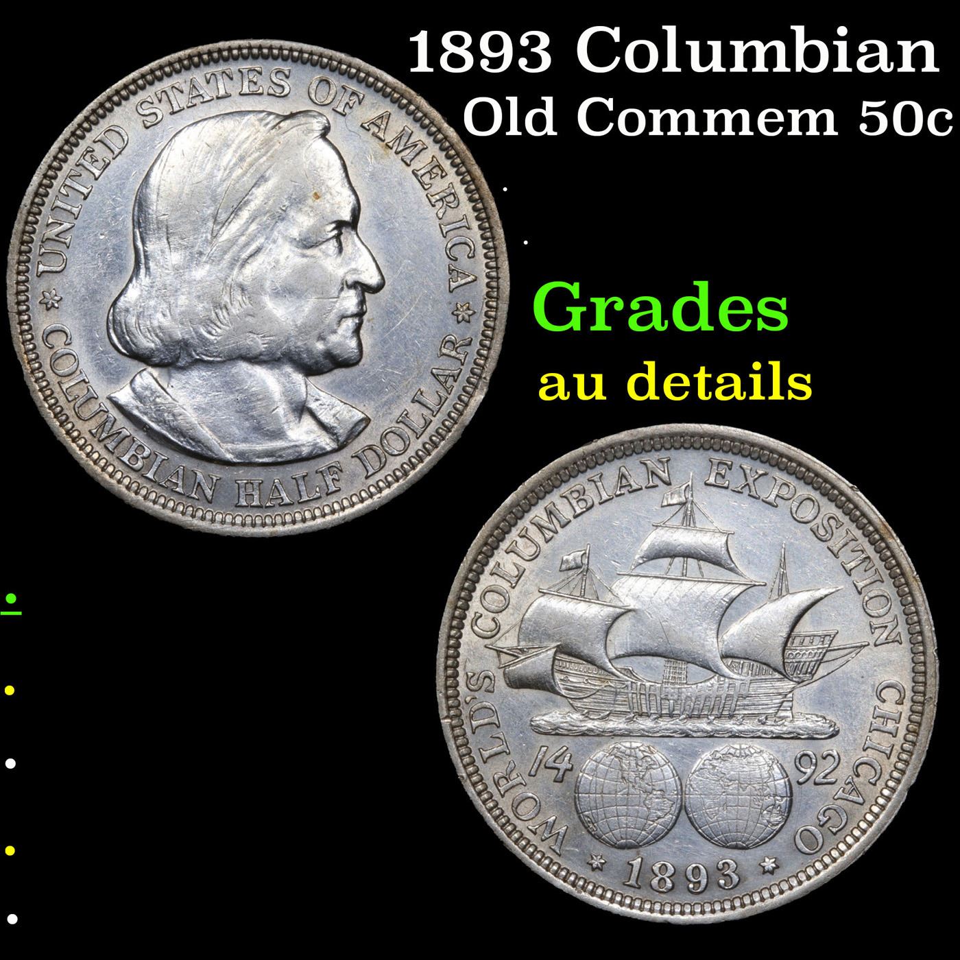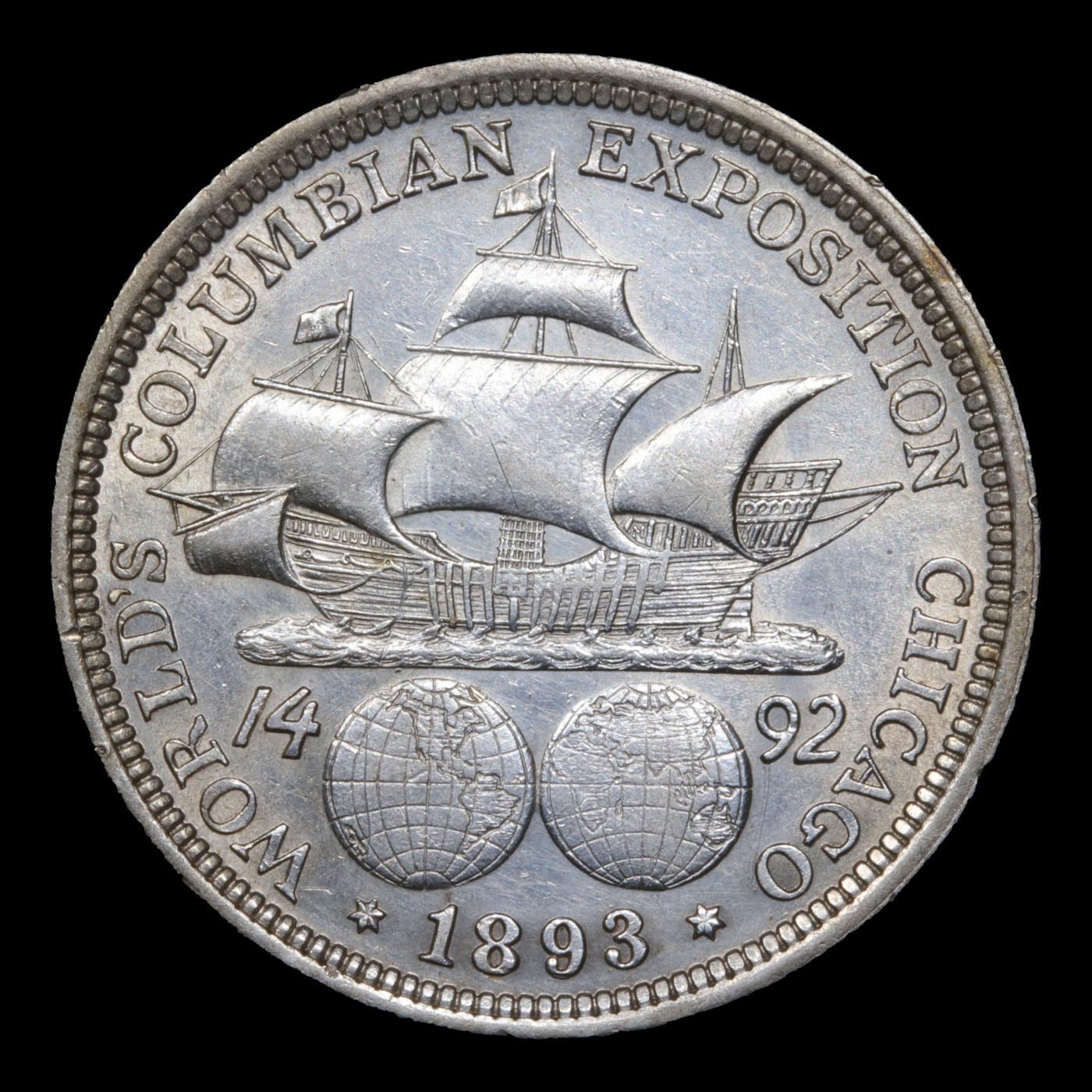 1893 Columbian Old Commem Half Dollar 50c Grades AU Details. The Columbus Half Dollar along with the Isabella Quarter were Minted in Honor of the 400th Anniversary of Columbus' Voyage to the New World. It was First Distributed at the Worlds Fair Honoring that Voyage. When examining a Columbian Exposition Half Dollar, the First Points to Show Wear are Columbus’ Eyebrow, Cheek and the Hair Behind his Forehead and Jaw. On the Reverse, Check the Foresail and Sainsail, as well as the Right Side of the Eastern Hemisphere.