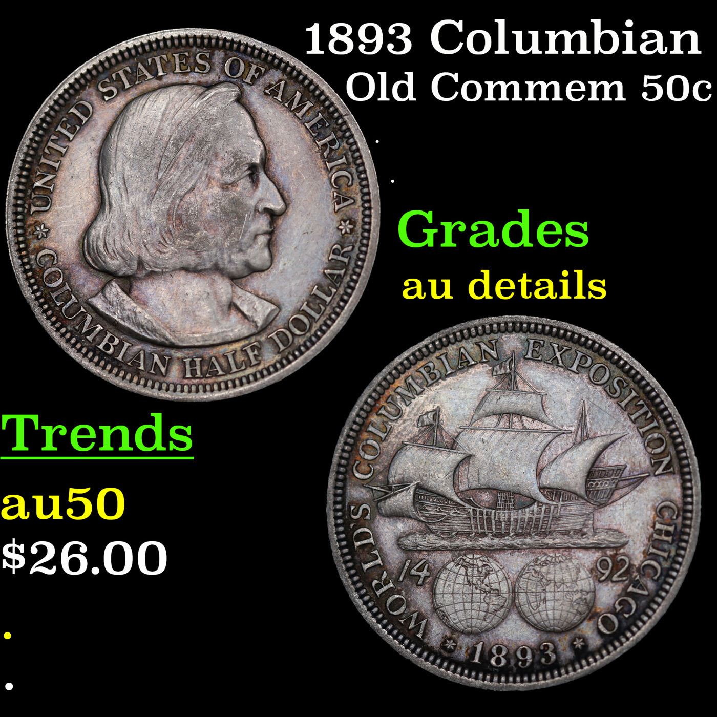 1893 Columbian Old Commem Half Dollar 50c Grades AU Details. The Columbus Half Dollar along with the Isabella Quarter were Minted in Honor of the 400th Anniversary of Columbus' Voyage to the New World. It was First Distributed at the Worlds Fair Honoring that Voyage. When examining a Columbian Exposition Half Dollar, the First Points to Show Wear are Columbus’ Eyebrow, Cheek and the Hair Behind his Forehead and Jaw. On the Reverse, Check the Foresail and Sainsail, as well as the Right Side of the Eastern Hemisphere.