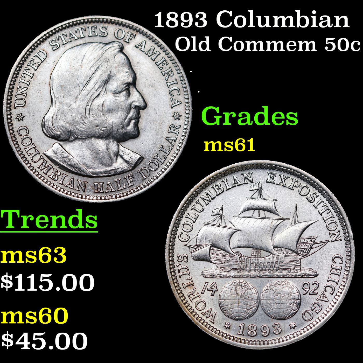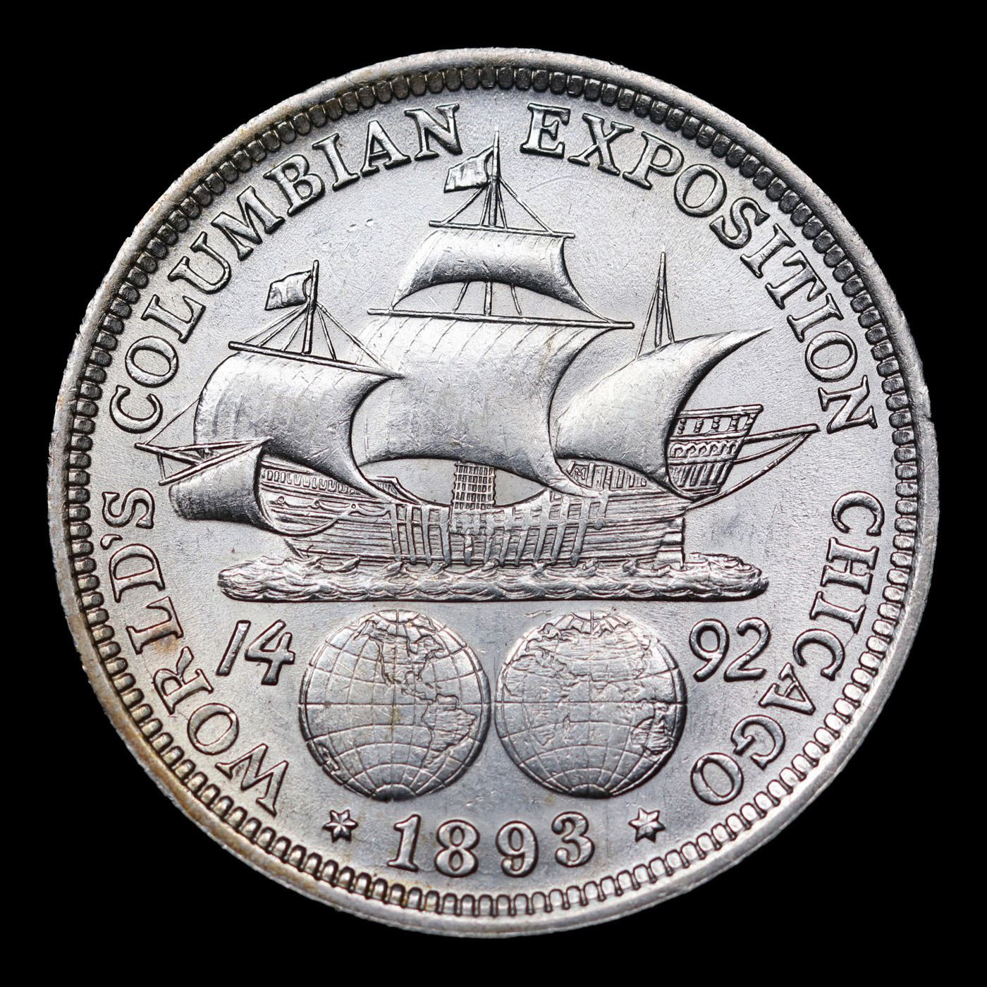 1893 Columbian Old Commem Half Dollar 50c Grades BU+. The Columbus Half Dollar along with the Isabella Quarter were Minted in Honor of the 400th Anniversary of Columbus' Voyage to the New World. It was First Distributed at the Worlds Fair Honoring that Voyage. When examining a Columbian Exposition Half Dollar, the First Points to Show Wear are Columbus’ Eyebrow, Cheek and the Hair Behind his Forehead and Jaw. On the Reverse, Check the Foresail and Sainsail, as well as the Right Side of the Eastern Hemisphere.