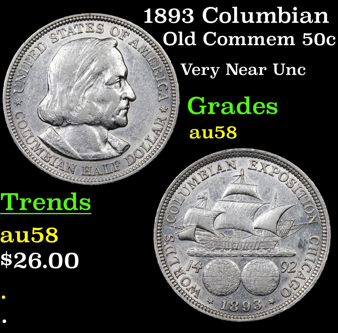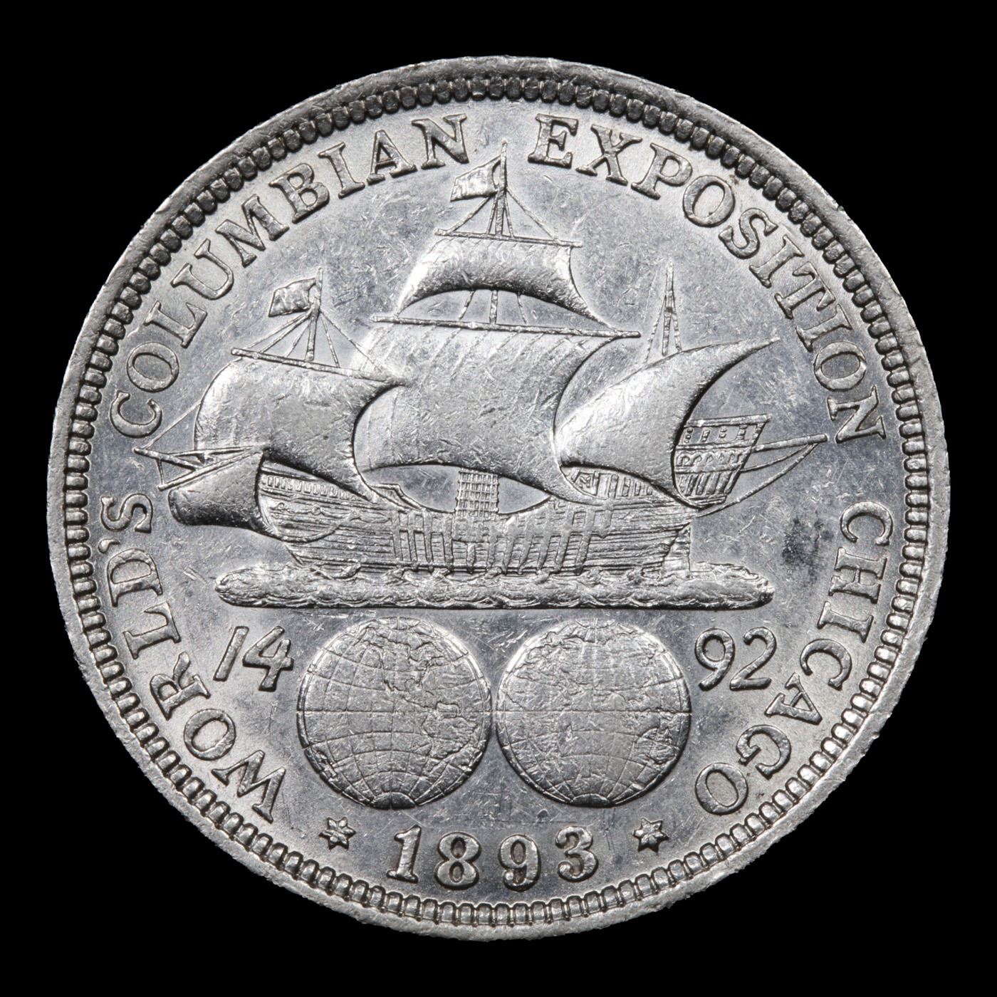 1893 Columbian Old Commem Half Dollar 50c Grades Choice AU/BU Slider.  The Columbus Half Dollar along with the Isabella Quarter were Minted in Honor of the 400th Anniversary of Columbus' Voyage to the New World. It was First Distributed at the Worlds Fair Honoring that Voyage. When examining a Columbian Exposition Half Dollar, the First Points to Show Wear are Columbus’ Eyebrow, Cheek and the Hair Behind his Forehead and Jaw. On the Reverse, Check the Foresail and Sainsail, as well as the Right Side of the Eastern Hemisphere.