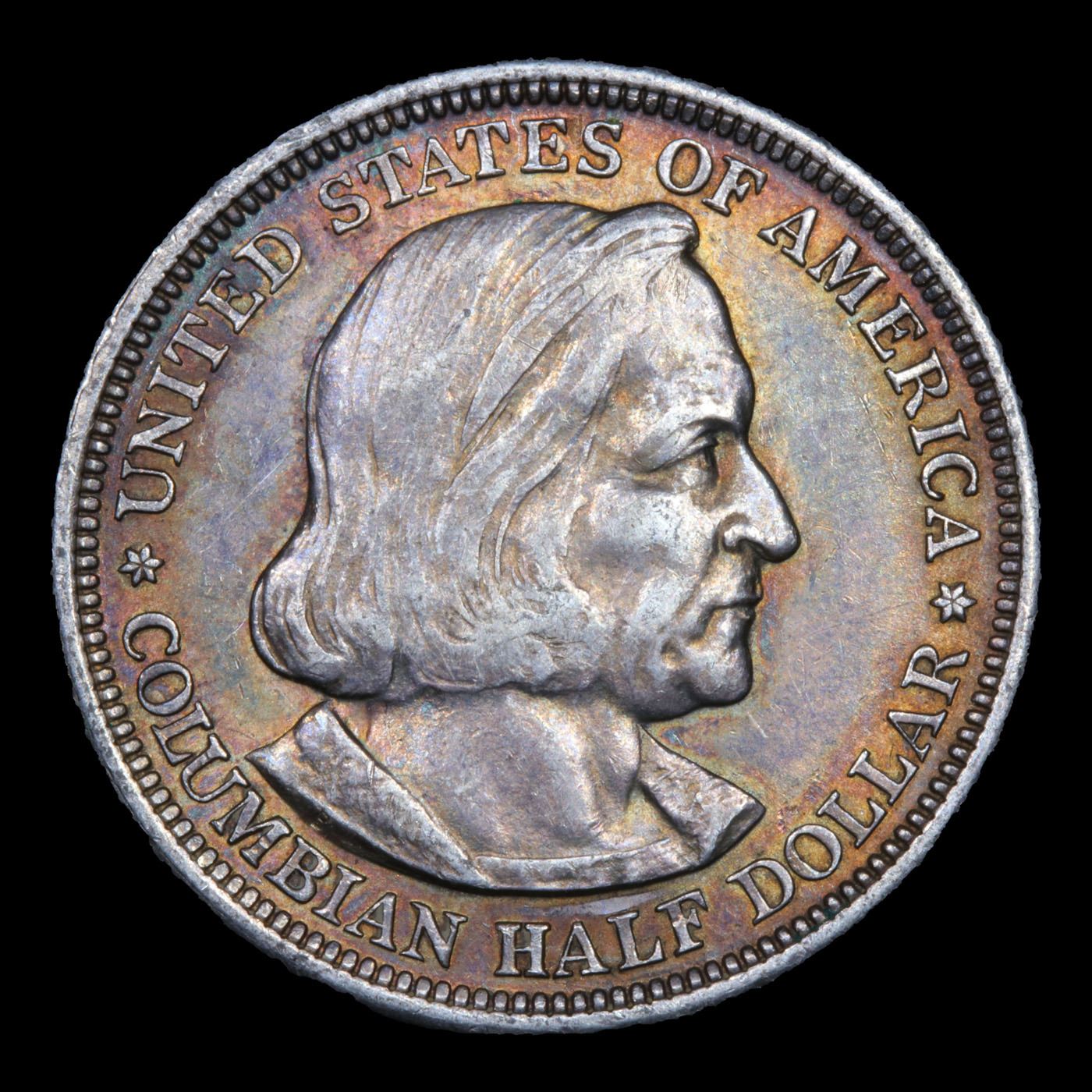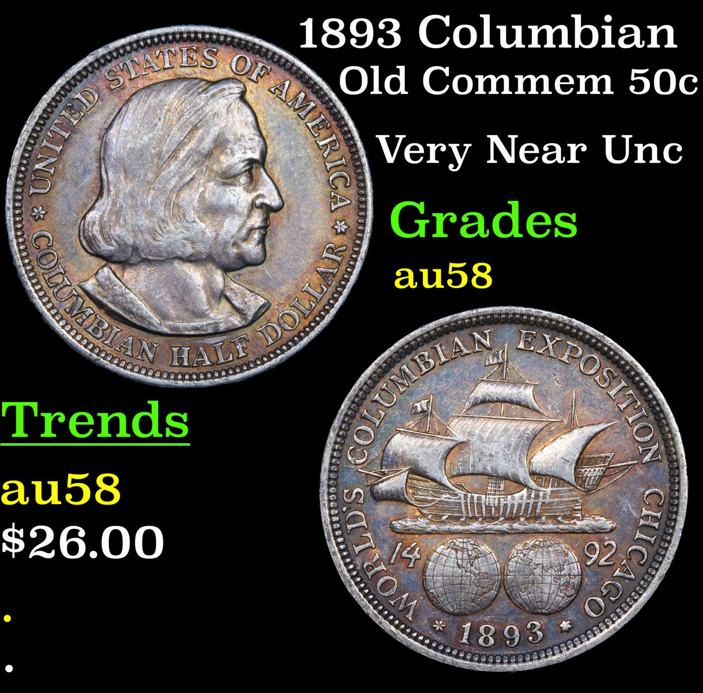 1893 Columbian Old Commem Half Dollar 50c Grades Choice AU/BU Slider. The Columbus Half Dollar along with the Isabella Quarter were Minted in Honor of the 400th Anniversary of Columbus' Voyage to the New World. It was First Distributed at the Worlds Fair Honoring that Voyage. When examining a Columbian Exposition Half Dollar, the First Points to Show Wear are Columbus’ Eyebrow, Cheek and the Hair Behind his Forehead and Jaw. On the Reverse, Check the Foresail and Sainsail, as well as the Right Side of the Eastern Hemisphere.