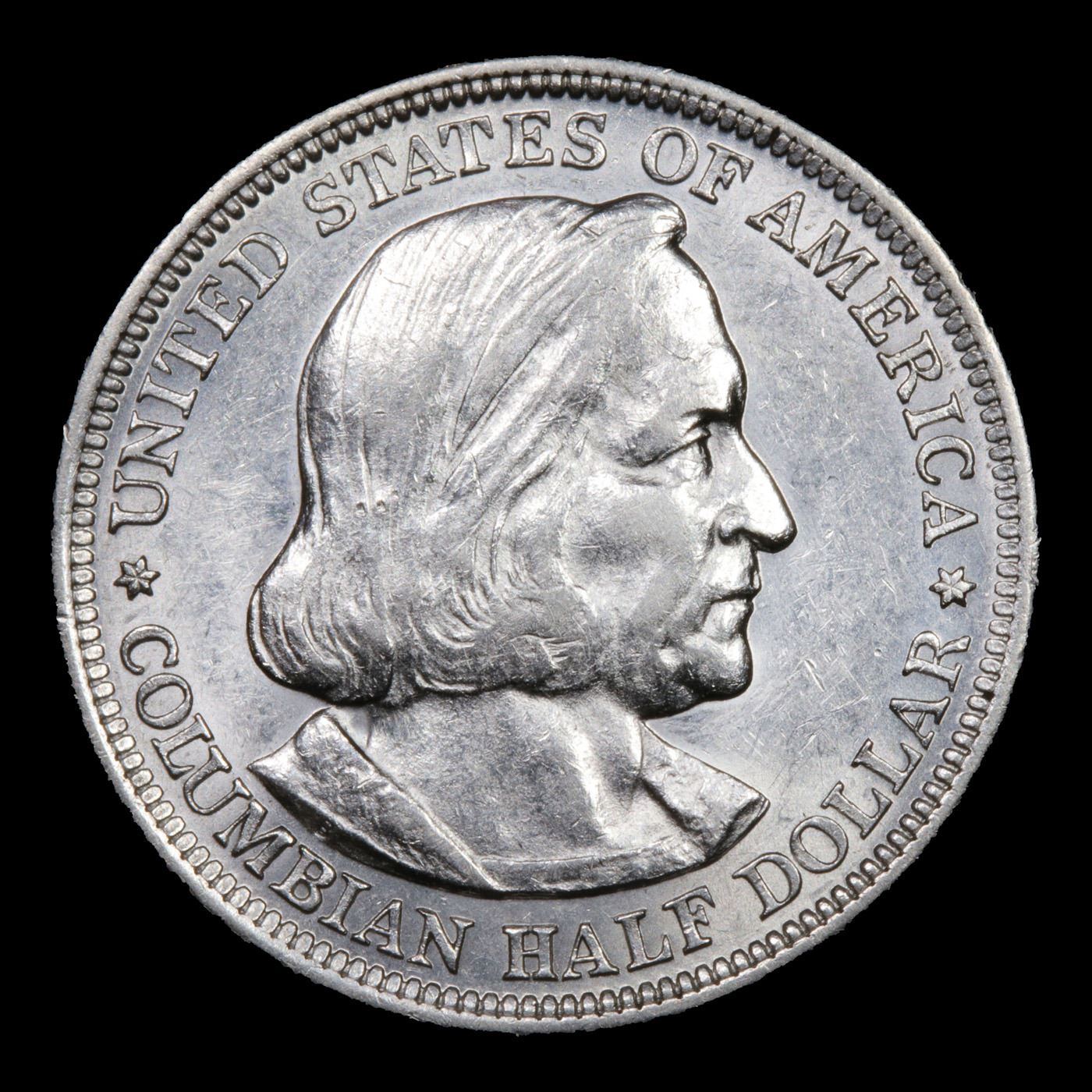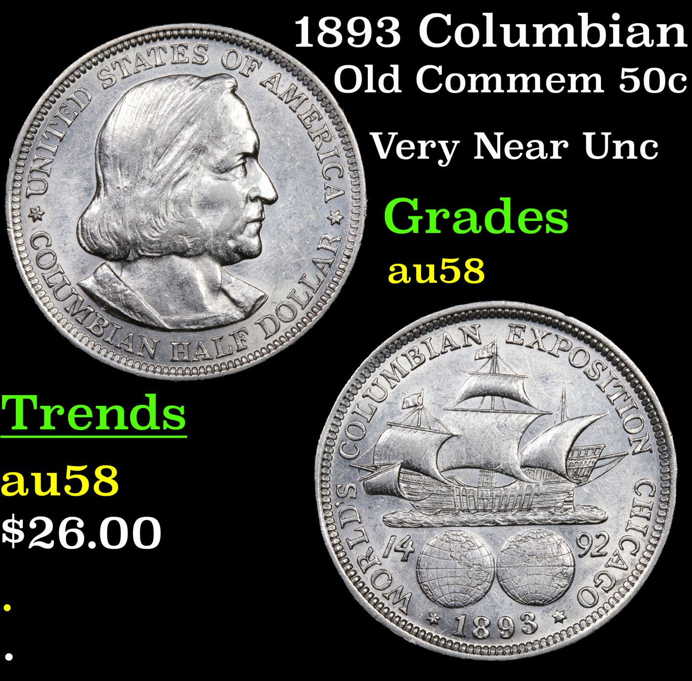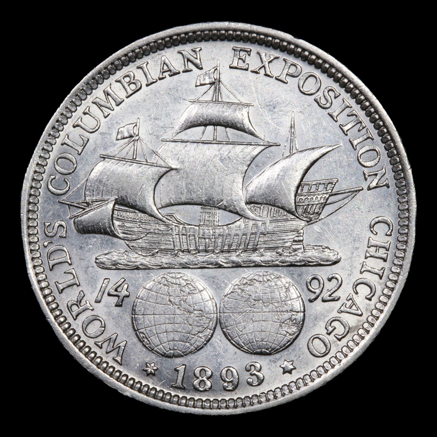 1893 Columbian Old Commem Half Dollar 50c Grades Choice AU/BU Slider. The Columbus Half Dollar along with the Isabella Quarter were Minted in Honor of the 400th Anniversary of Columbus' Voyage to the New World. It was First Distributed at the Worlds Fair Honoring that Voyage. When examining a Columbian Exposition Half Dollar, the First Points to Show Wear are Columbus’ Eyebrow, Cheek and the Hair Behind his Forehead and Jaw. On the Reverse, Check the Foresail and Sainsail, as well as the Right Side of the Eastern Hemisphere.