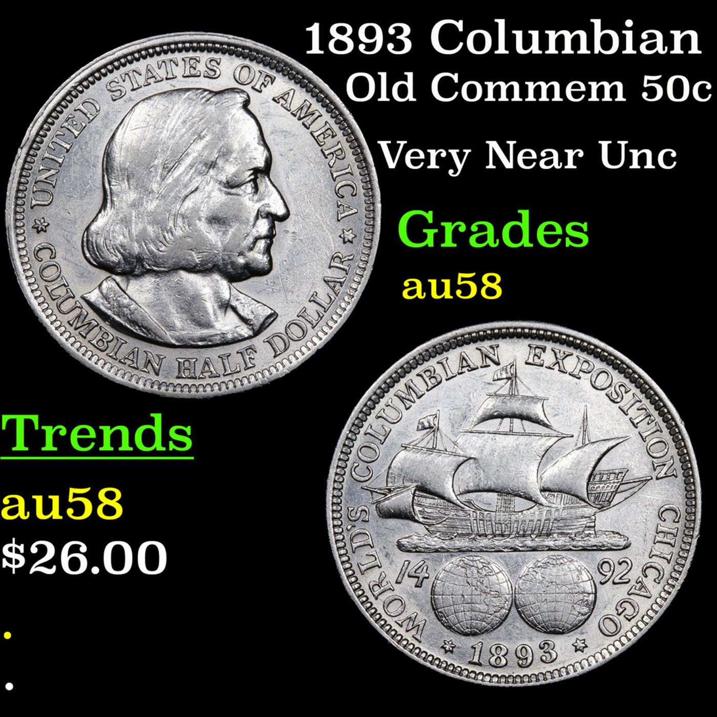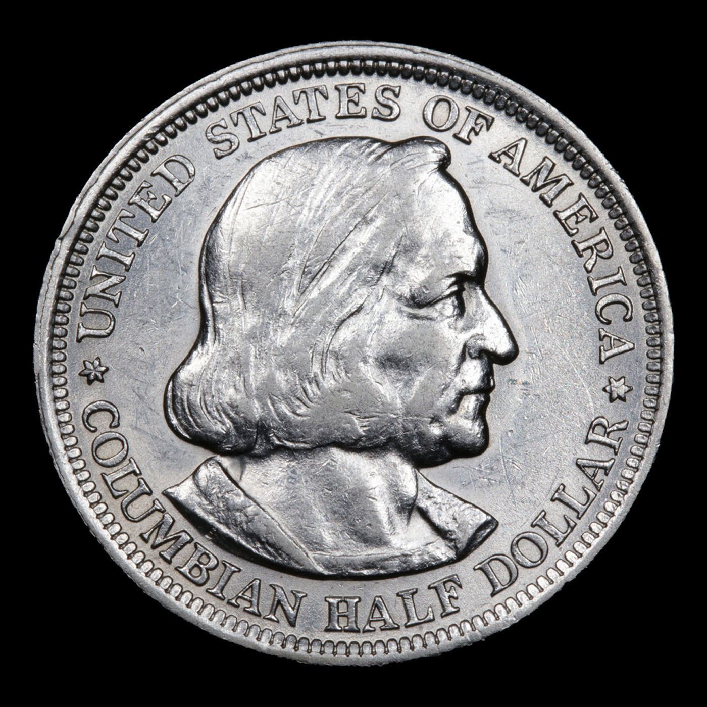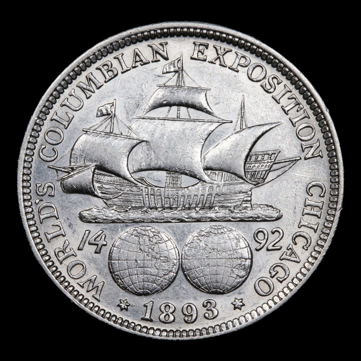 1893 Columbian Old Commem Half Dollar 50c Grades Choice AU/BU Slider. The Columbus Half Dollar along with the Isabella Quarter were Minted in Honor of the 400th Anniversary of Columbus' Voyage to the New World. It was First Distributed at the Worlds Fair Honoring that Voyage. When examining a Columbian Exposition Half Dollar, the First Points to Show Wear are Columbus’ Eyebrow, Cheek and the Hair Behind his Forehead and Jaw. On the Reverse, Check the Foresail and Sainsail, as well as the Right Side of the Eastern Hemisphere.