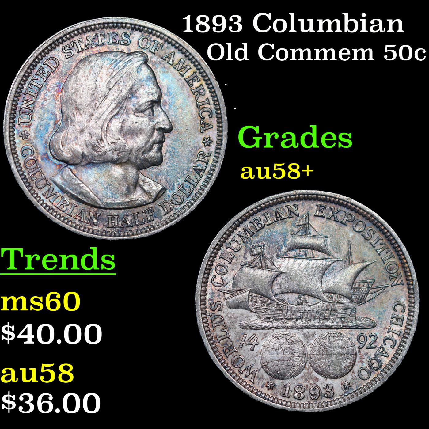 1893 Columbian Old Commem Half Dollar 50c Grades Choice AU/BU Slider+. The Columbus Half Dollar along with the Isabella Quarter were Minted in Honor of the 400th Anniversary of Columbus' Voyage to the New World. It was First Distributed at the Worlds Fair Honoring that Voyage. When examining a Columbian Exposition Half Dollar, the First Points to Show Wear are Columbus’ Eyebrow, Cheek and the Hair Behind his Forehead and Jaw. On the Reverse, Check the Foresail and Sainsail, as well as the Right Side of the Eastern Hemisphere.