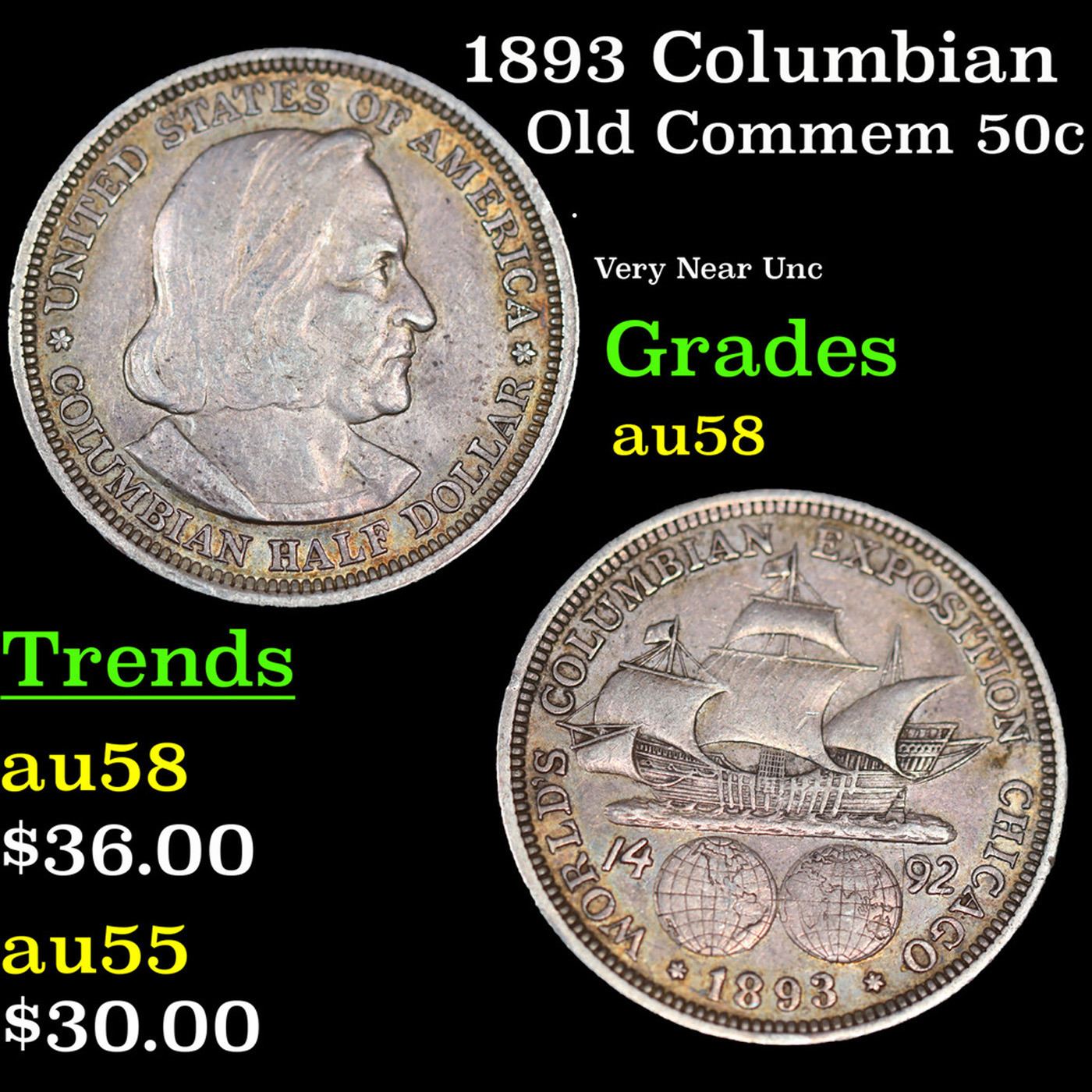 1893 Columbian Old Commem Half Dollar 50c Grades Choice AU/BU Slider. The Columbus Half Dollar along with the Isabella Quarter were Minted in Honor of the 400th Anniversary of Columbus' Voyage to the New World. It was First Distributed at the Worlds Fair Honoring that Voyage. When examining a Columbian Exposition Half Dollar, the First Points to Show Wear are Columbus’ Eyebrow, Cheek and the Hair Behind his Forehead and Jaw. On the Reverse, Check the Foresail and Sainsail, as well as the Right Side of the Eastern Hemisphere.