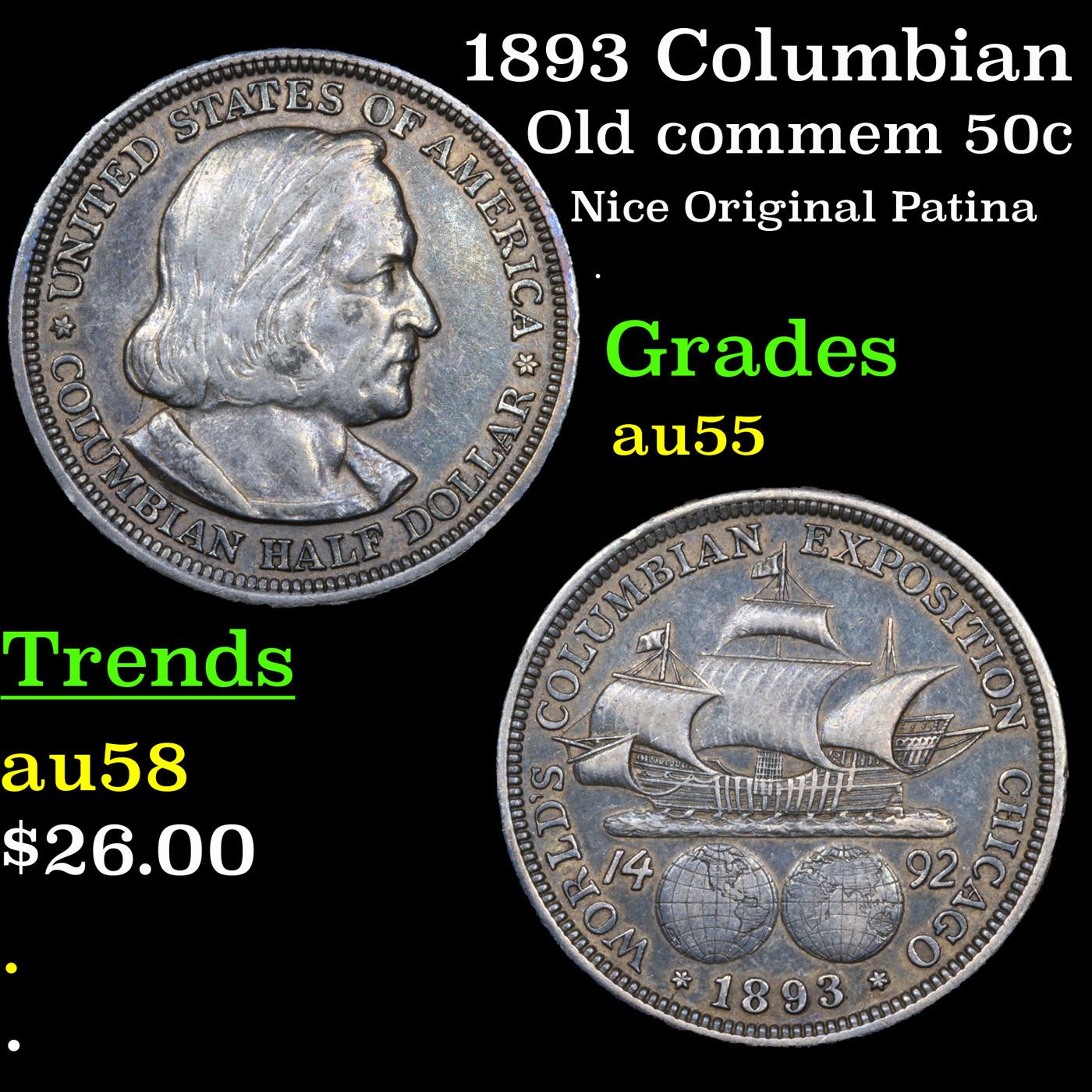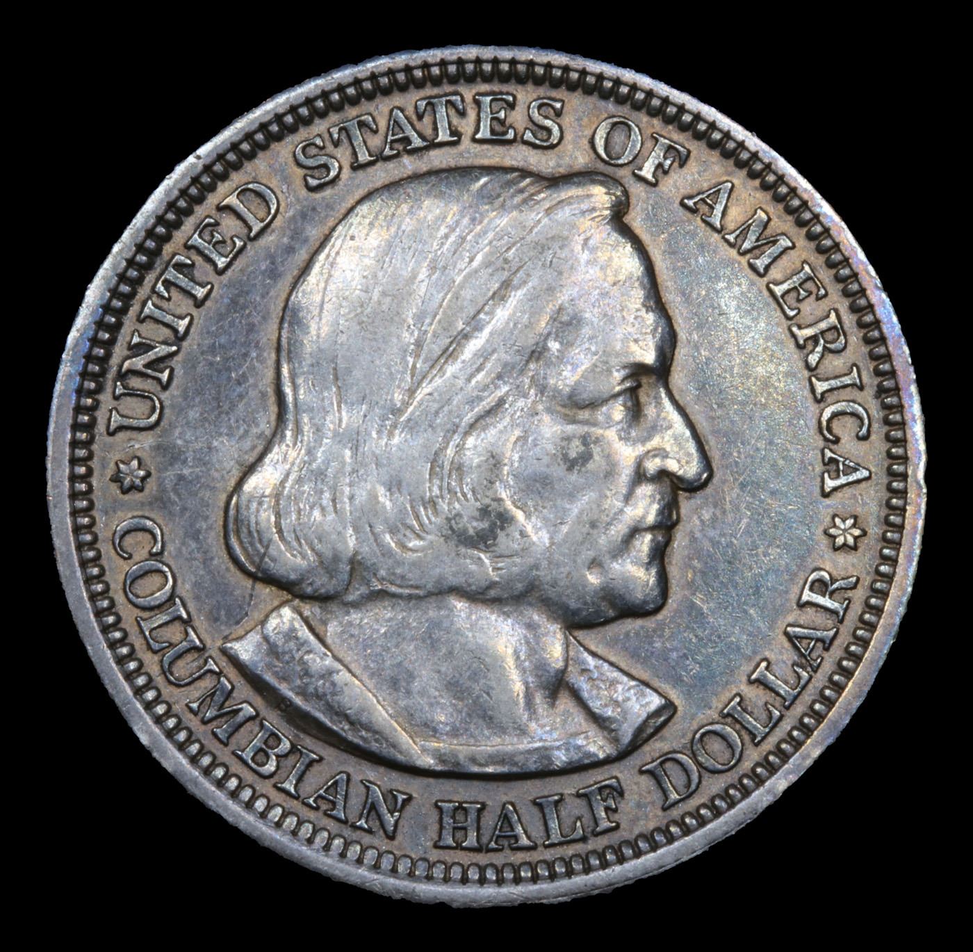1893 Columbian Old Commem Half Dollar 50c Grades Choice AU. The Columbus Half Dollar along with the Isabella Quarter were Minted in Honor of the 400th Anniversary of Columbus' Voyage to the New World. It was First Distributed at the Worlds Fair Honoring that Voyage. When examining a Columbian Exposition Half Dollar, the First Points to Show Wear are Columbus’ Eyebrow, Cheek and the Hair Behind his Forehead and Jaw. On the Reverse, Check the Foresail and Sainsail, as well as the Right Side of the Eastern Hemisphere.