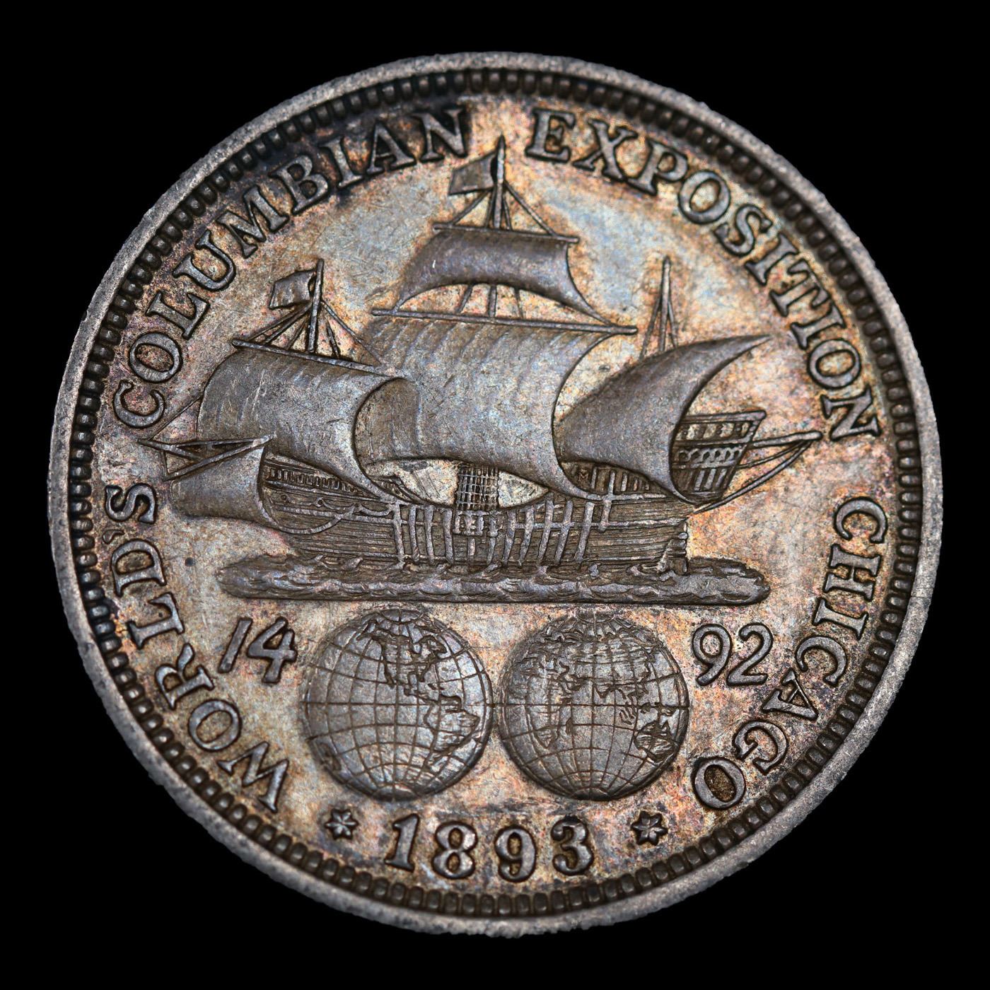 1893 Columbian Old Commem Half Dollar 50c Grades Choice AU. The Columbus Half Dollar along with the Isabella Quarter were Minted in Honor of the 400th Anniversary of Columbus' Voyage to the New World. It was First Distributed at the Worlds Fair Honoring that Voyage. When examining a Columbian Exposition Half Dollar, the First Points to Show Wear are Columbus’ Eyebrow, Cheek and the Hair Behind his Forehead and Jaw. On the Reverse, Check the Foresail and Sainsail, as well as the Right Side of the Eastern Hemisphere.