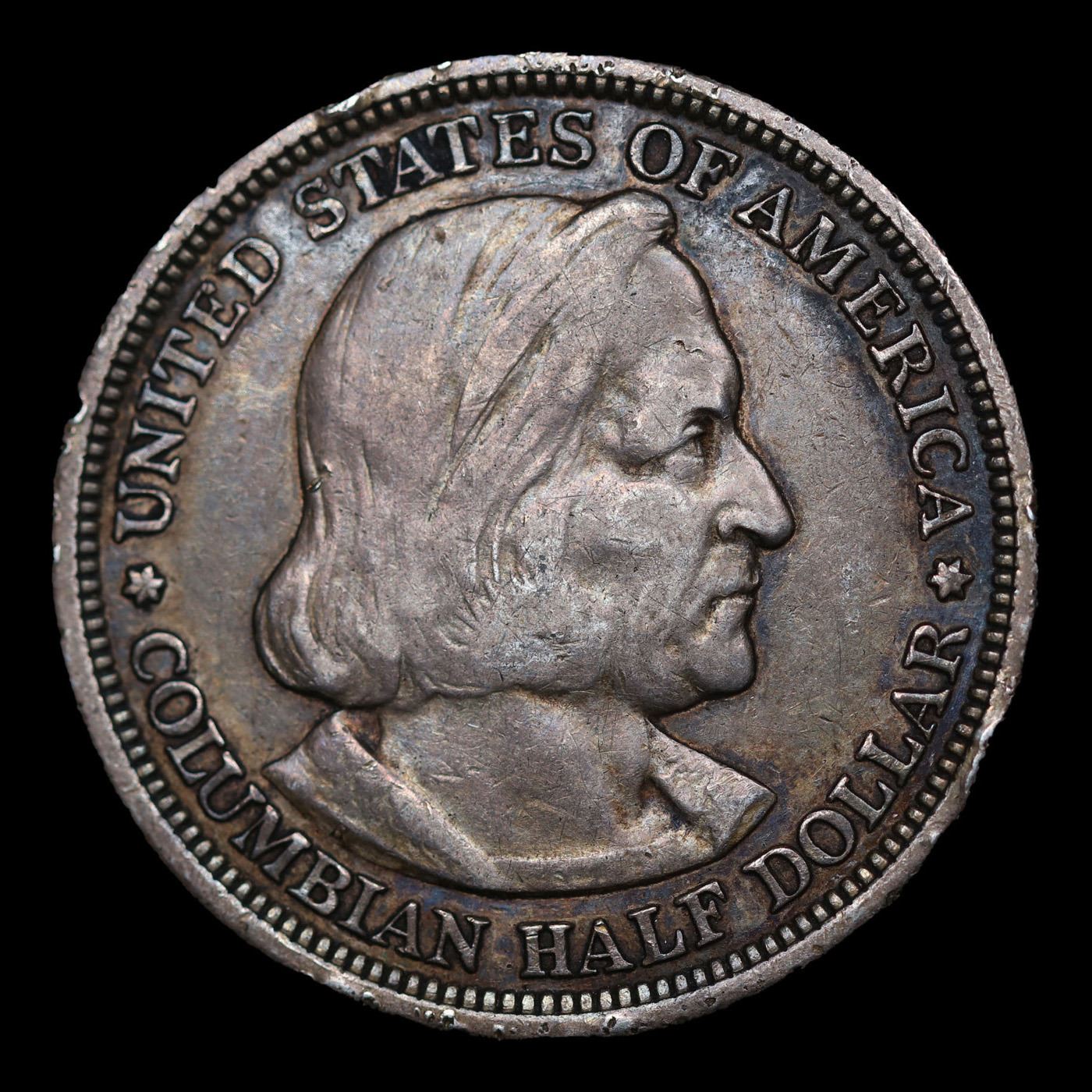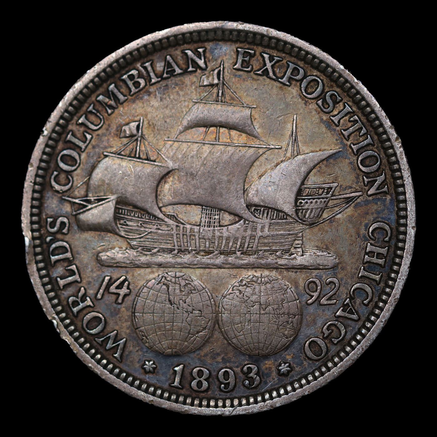 1893 Columbian Old Commem Half Dollar 50c Grades Choice AU. The Columbus Half Dollar along with the Isabella Quarter were Minted in Honor of the 400th Anniversary of Columbus' Voyage to the New World. It was First Distributed at the Worlds Fair Honoring that Voyage. When examining a Columbian Exposition Half Dollar, the First Points to Show Wear are Columbus’ Eyebrow, Cheek and the Hair Behind his Forehead and Jaw. On the Reverse, Check the Foresail and Sainsail, as well as the Right Side of the Eastern Hemisphere.