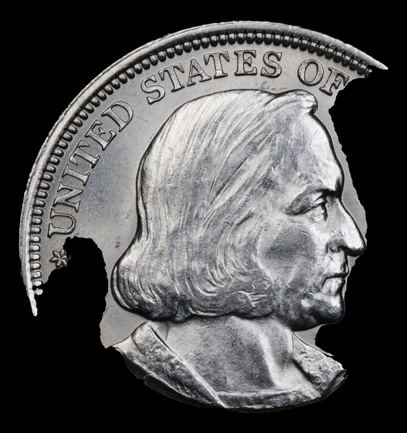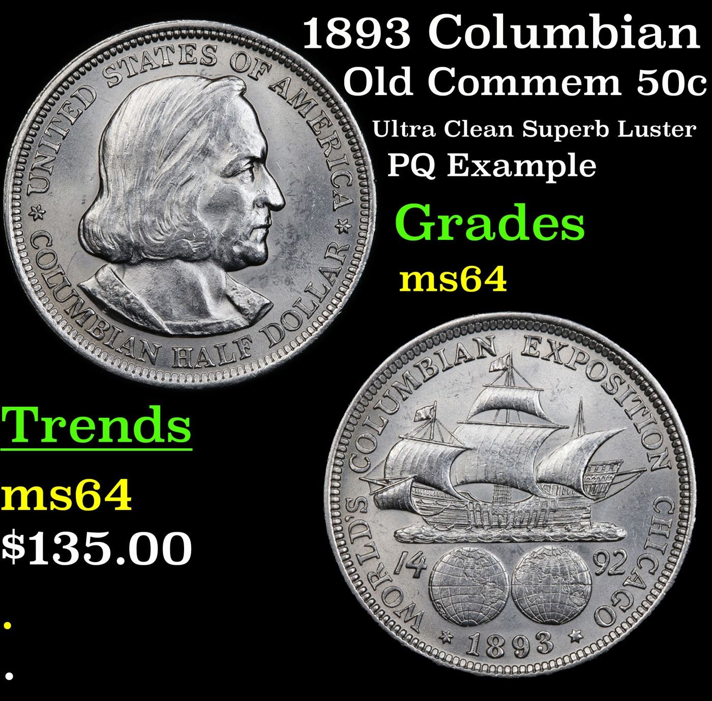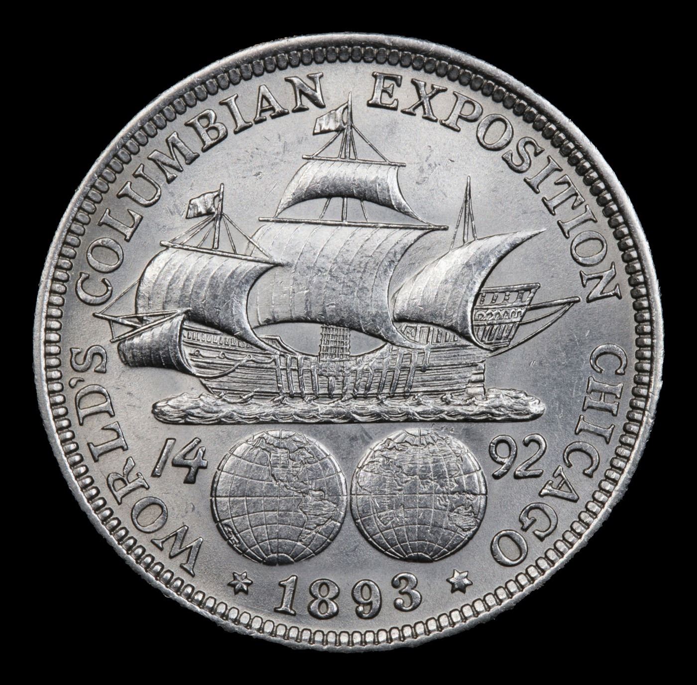 1893 Columbian Old Commem Half Dollar 50c Grades Choice Unc. The Columbus Half Dollar along with the Isabella Quarter were Minted in Honor of the 400th Anniversary of Columbus' Voyage to the New World. It was First Distributed at the Worlds Fair Honoring that Voyage. When examining a Columbian Exposition Half Dollar, the First Points to Show Wear are Columbus’ Eyebrow, Cheek and the Hair Behind his Forehead and Jaw. On the Reverse, Check the Foresail and Sainsail, as well as the Right Side of the Eastern Hemisphere.