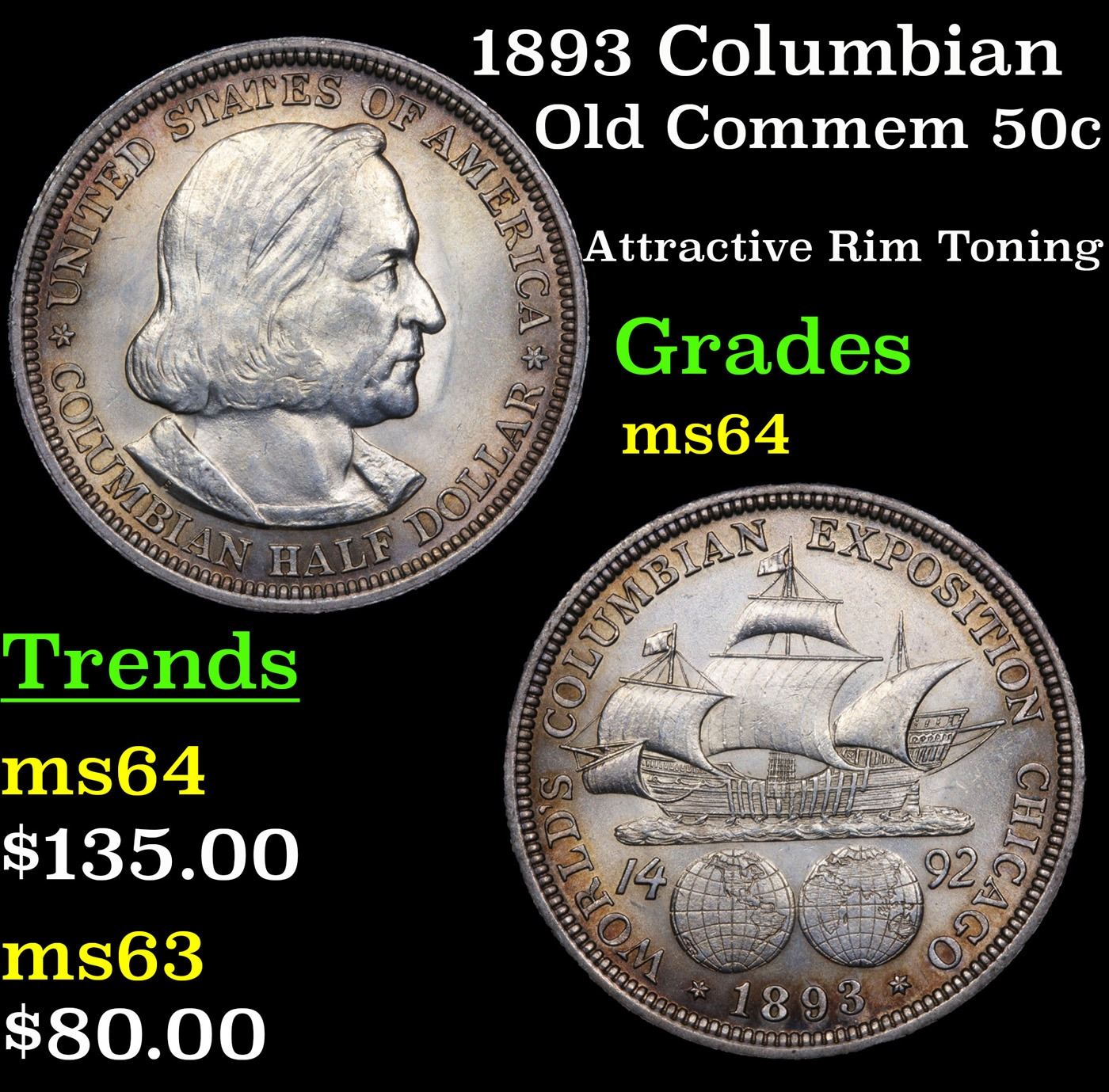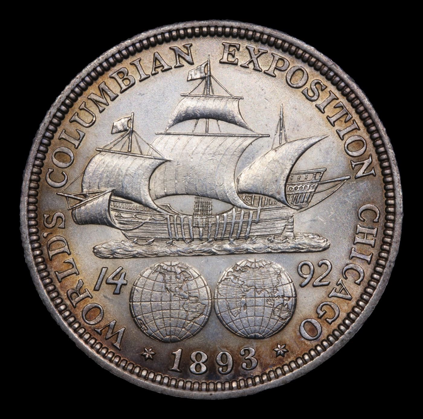 1893 Columbian Old Commem Half Dollar 50c Grades Choice Unc. The Columbus Half Dollar along with the Isabella Quarter were Minted in Honor of the 400th Anniversary of Columbus' Voyage to the New World. It was First Distributed at the Worlds Fair Honoring that Voyage. When examining a Columbian Exposition Half Dollar, the First Points to Show Wear are Columbus’ Eyebrow, Cheek and the Hair Behind his Forehead and Jaw. On the Reverse, Check the Foresail and Sainsail, as well as the Right Side of the Eastern Hemisphere.