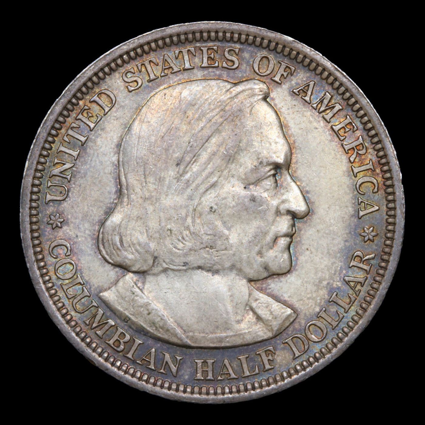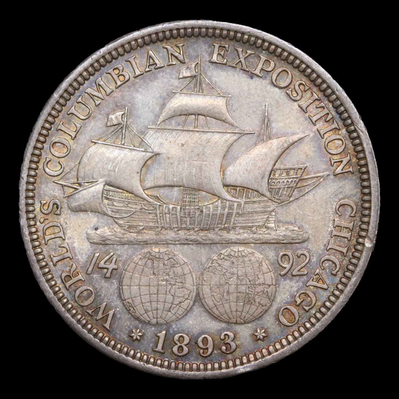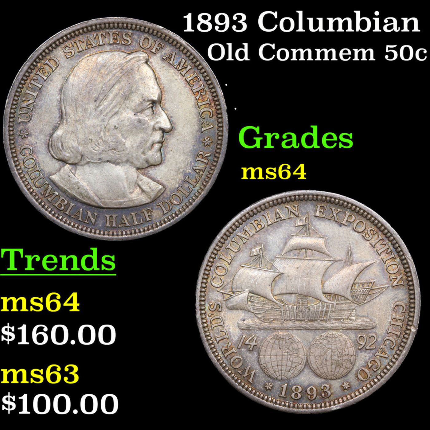 1893 Columbian Old Commem Half Dollar 50c Grades Choice Unc. The Columbus Half Dollar along with the Isabella Quarter were Minted in Honor of the 400th Anniversary of Columbus' Voyage to the New World. It was First Distributed at the Worlds Fair Honoring that Voyage. When examining a Columbian Exposition Half Dollar, the First Points to Show Wear are Columbus’ Eyebrow, Cheek and the Hair Behind his Forehead and Jaw. On the Reverse, Check the Foresail and Sainsail, as well as the Right Side of the Eastern Hemisphere.