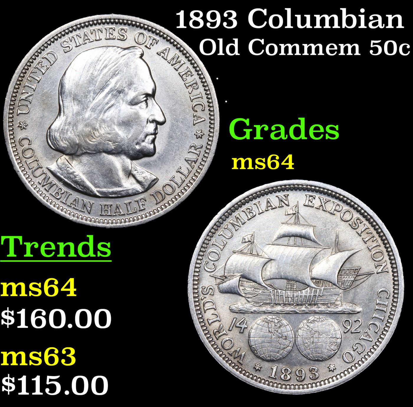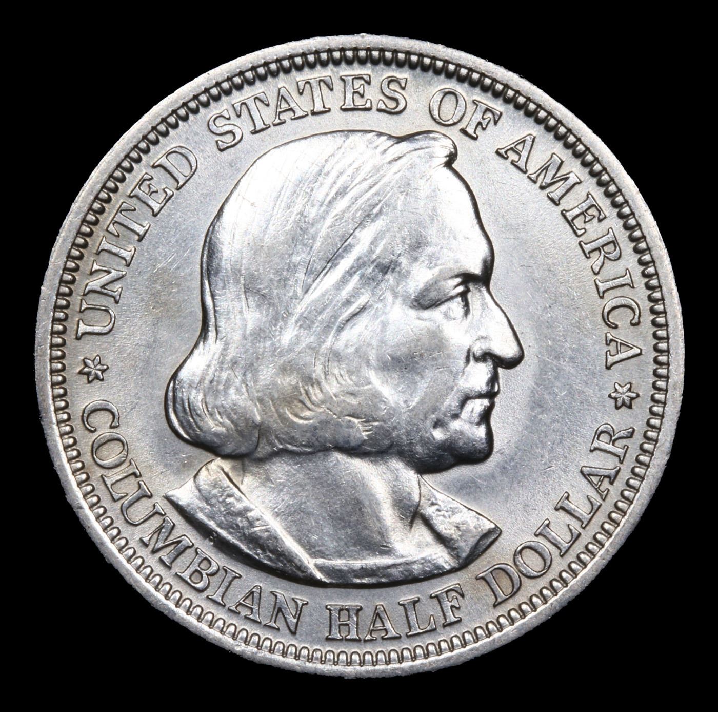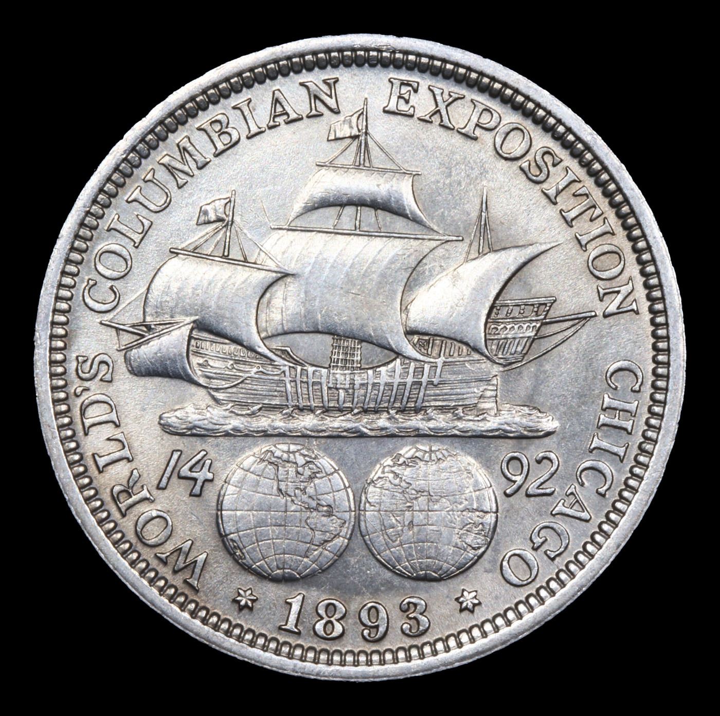 1893 Columbian Old Commem Half Dollar 50c Grades Choice Unc. The Columbus Half Dollar along with the Isabella Quarter were Minted in Honor of the 400th Anniversary of Columbus' Voyage to the New World. It was First Distributed at the Worlds Fair Honoring that Voyage. When examining a Columbian Exposition Half Dollar, the First Points to Show Wear are Columbus’ Eyebrow, Cheek and the Hair Behind his Forehead and Jaw. On the Reverse, Check the Foresail and Sainsail, as well as the Right Side of the Eastern Hemisphere.