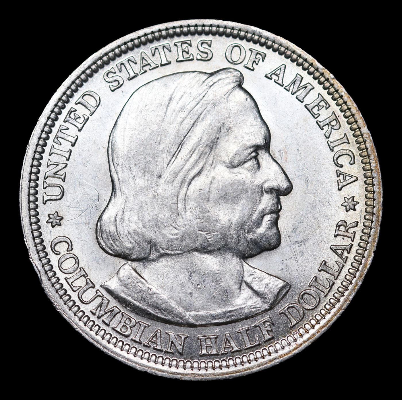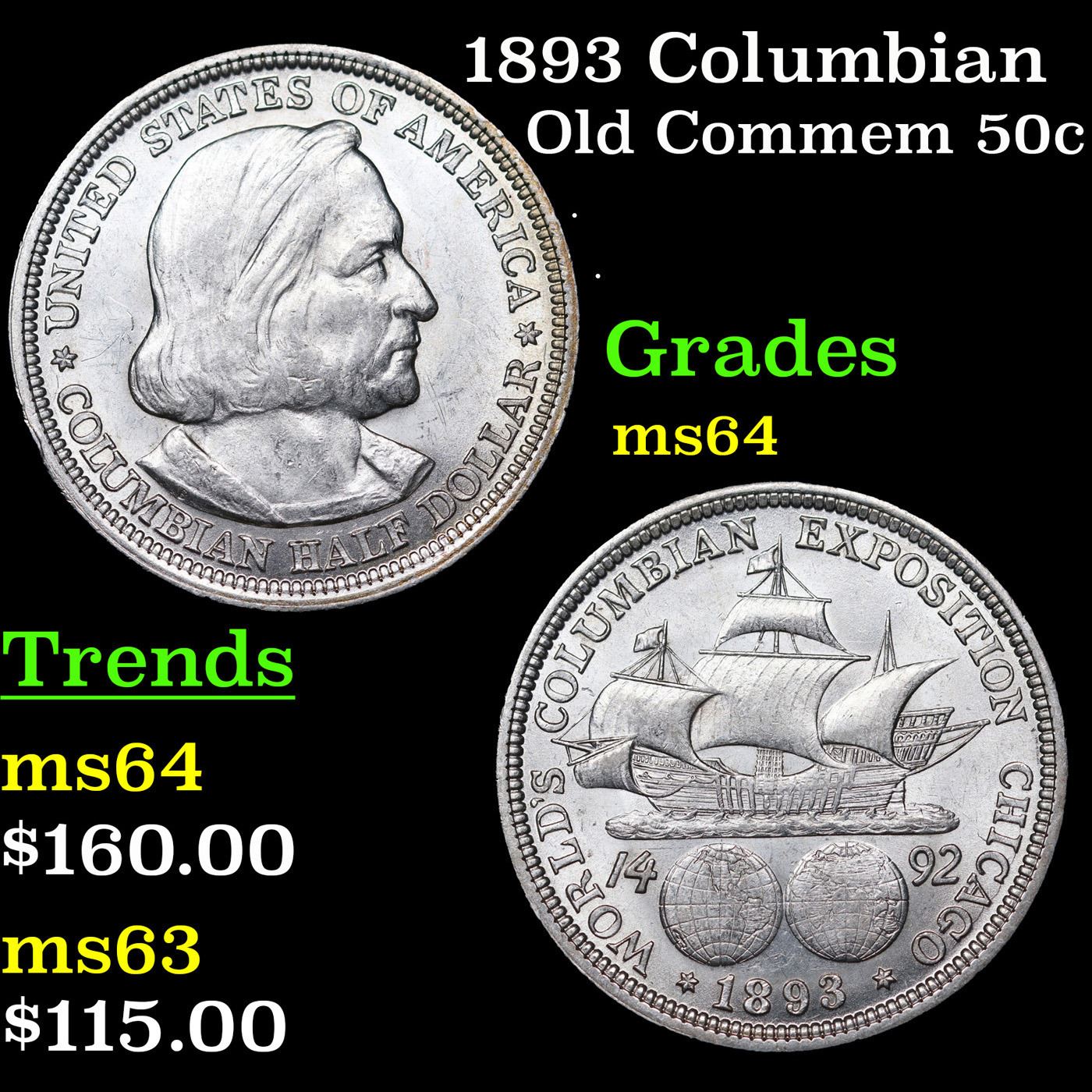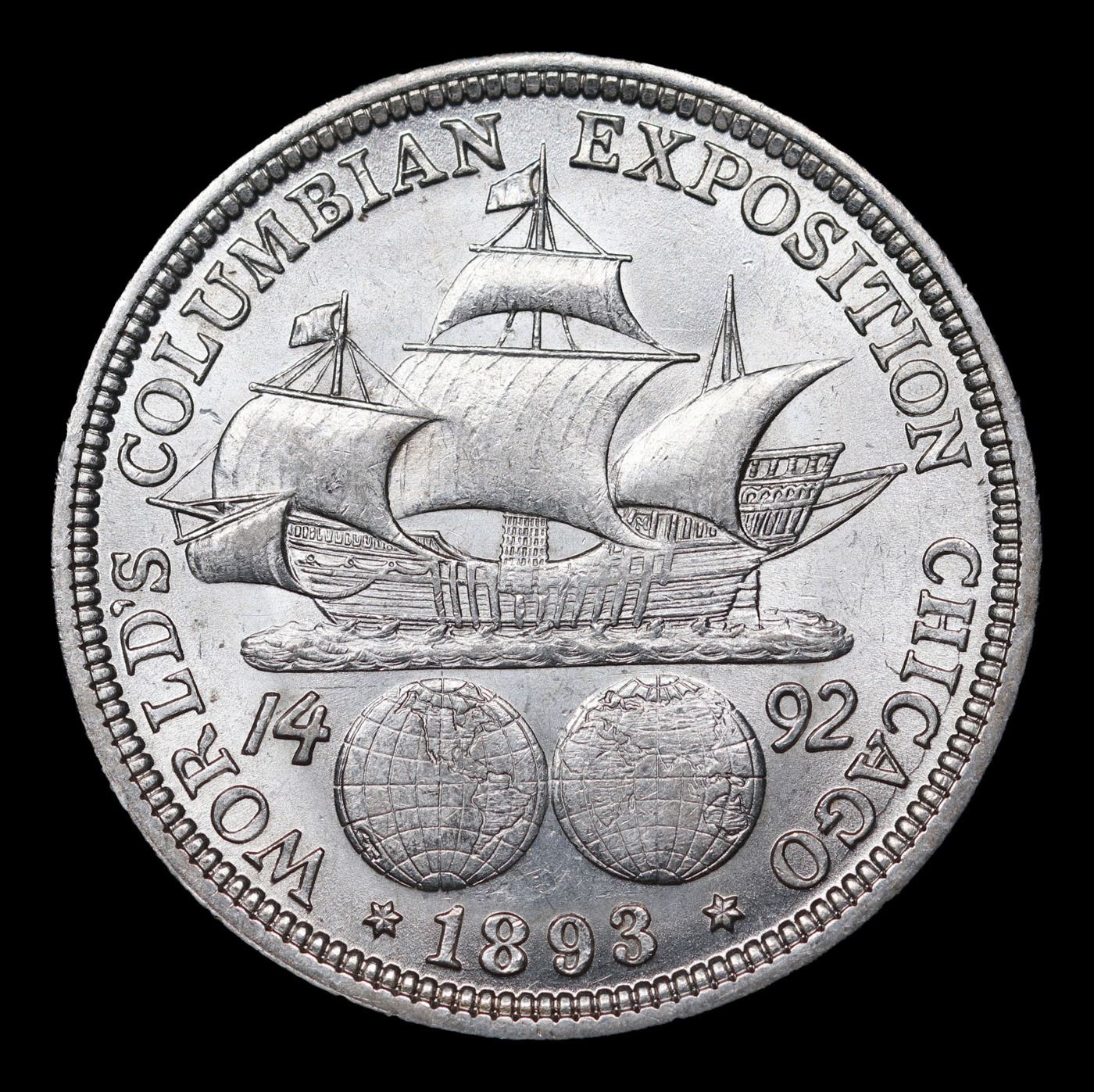 1893 Columbian Old Commem Half Dollar 50c Grades Choice Unc. The Columbus Half Dollar along with the Isabella Quarter were Minted in Honor of the 400th Anniversary of Columbus' Voyage to the New World. It was First Distributed at the Worlds Fair Honoring that Voyage. When examining a Columbian Exposition Half Dollar, the First Points to Show Wear are Columbus’ Eyebrow, Cheek and the Hair Behind his Forehead and Jaw. On the Reverse, Check the Foresail and Sainsail, as well as the Right Side of the Eastern Hemisphere.