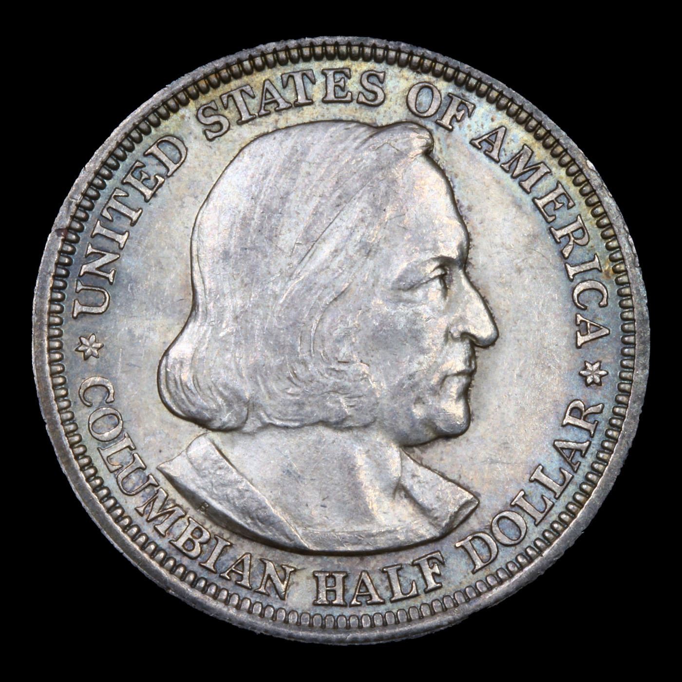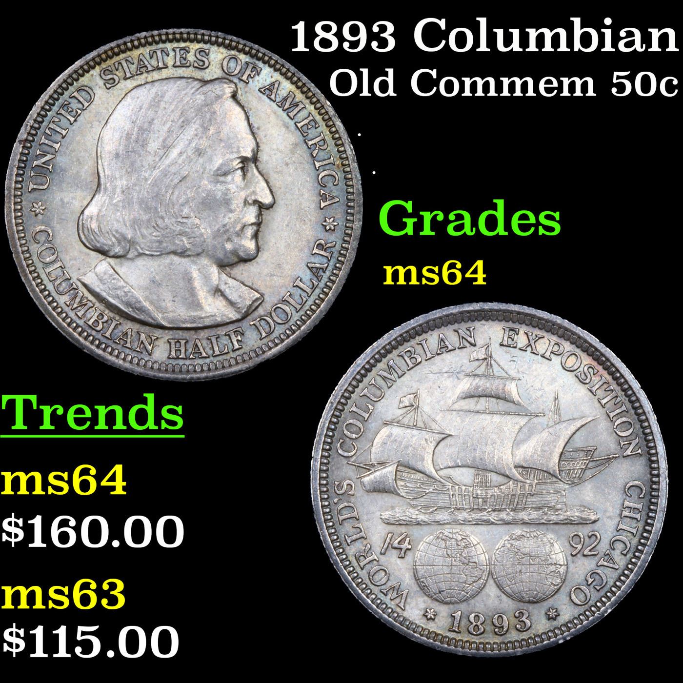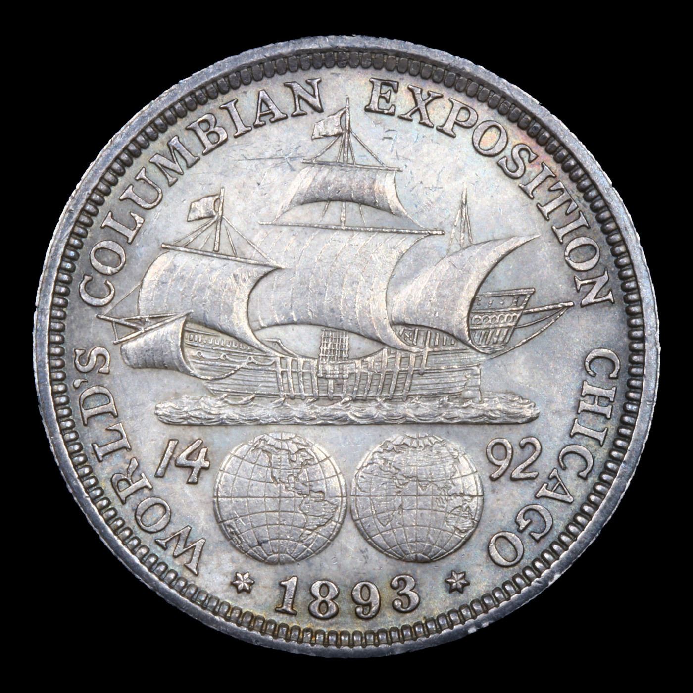 1893 Columbian Old Commem Half Dollar 50c Grades Choice Unc. The Columbus Half Dollar along with the Isabella Quarter were Minted in Honor of the 400th Anniversary of Columbus' Voyage to the New World. It was First Distributed at the Worlds Fair Honoring that Voyage. When examining a Columbian Exposition Half Dollar, the First Points to Show Wear are Columbus’ Eyebrow, Cheek and the Hair Behind his Forehead and Jaw. On the Reverse, Check the Foresail and Sainsail, as well as the Right Side of the Eastern Hemisphere.