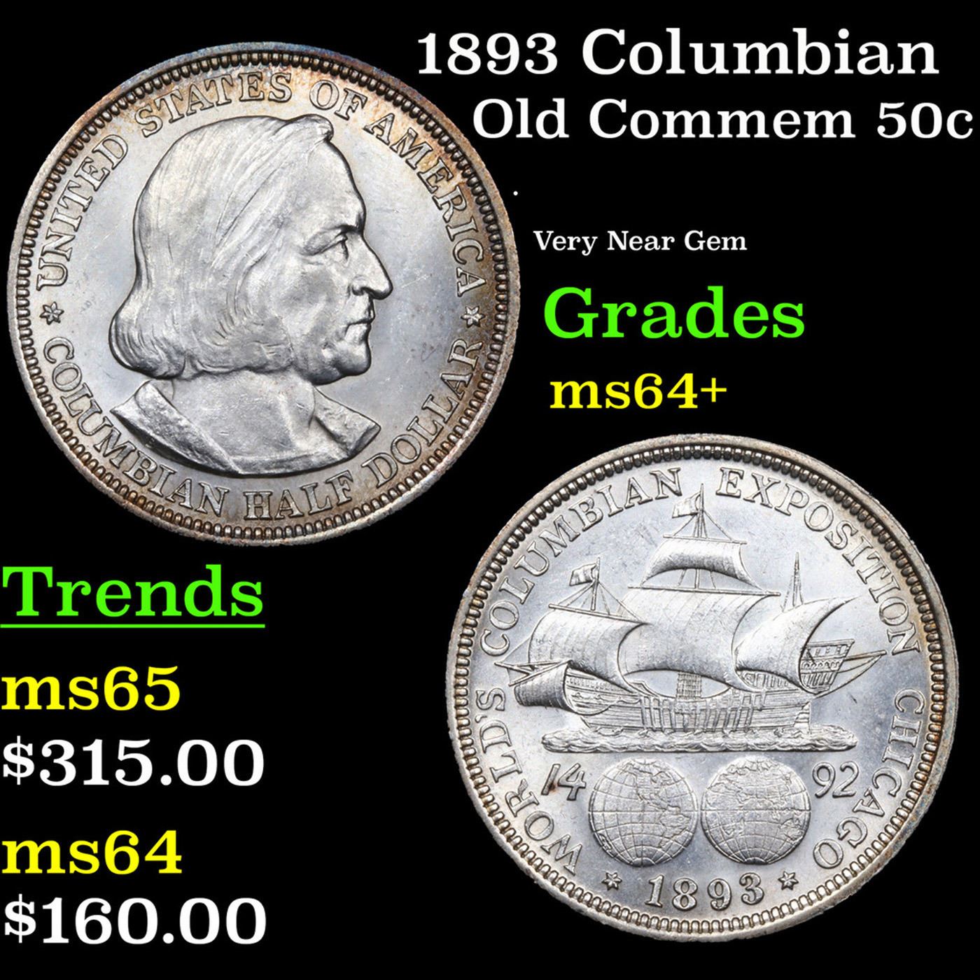 1893 Columbian Old Commem Half Dollar 50c Grades Choice+ Unc. The Columbus Half Dollar along with the Isabella Quarter were Minted in Honor of the 400th Anniversary of Columbus' Voyage to the New World. It was First Distributed at the Worlds Fair Honoring that Voyage. When examining a Columbian Exposition Half Dollar, the First Points to Show Wear are Columbus’ Eyebrow, Cheek and the Hair Behind his Forehead and Jaw. On the Reverse, Check the Foresail and Sainsail, as well as the Right Side of the Eastern Hemisphere.