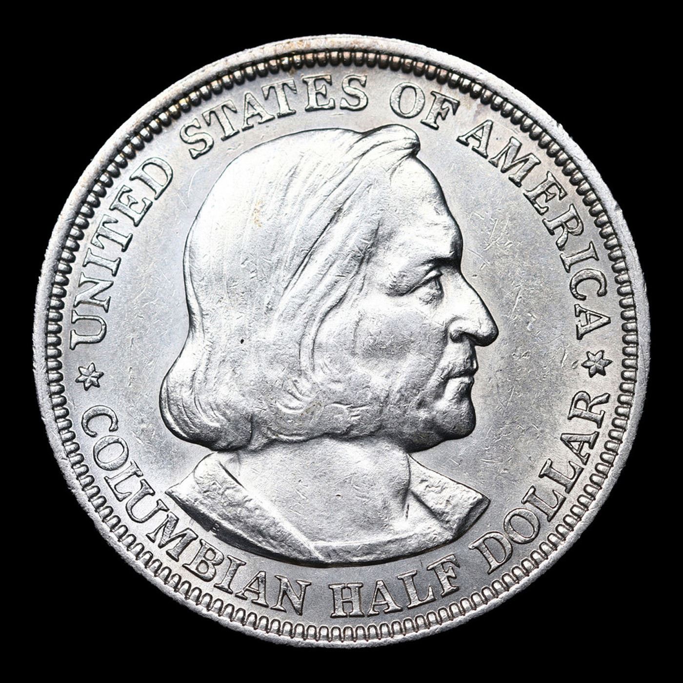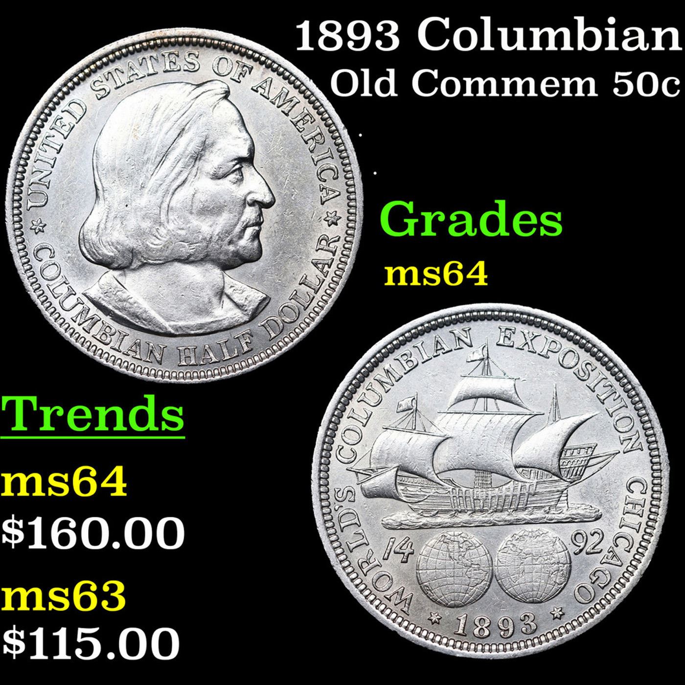 1893 Columbian Old Commem Half Dollar 50c Grades Choice Unc. The Columbus Half Dollar along with the Isabella Quarter were Minted in Honor of the 400th Anniversary of Columbus' Voyage to the New World. It was First Distributed at the Worlds Fair Honoring that Voyage. When examining a Columbian Exposition Half Dollar, the First Points to Show Wear are Columbus’ Eyebrow, Cheek and the Hair Behind his Forehead and Jaw. On the Reverse, Check the Foresail and Sainsail, as well as the Right Side of the Eastern Hemisphere.