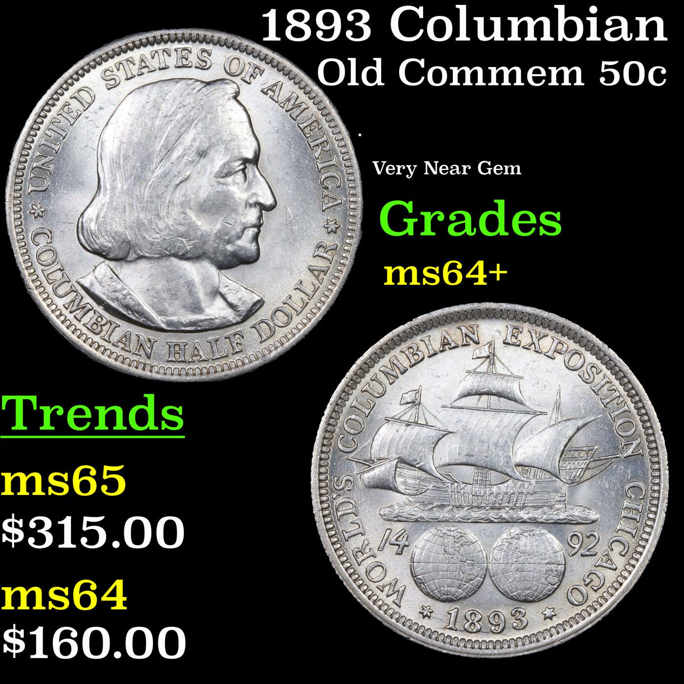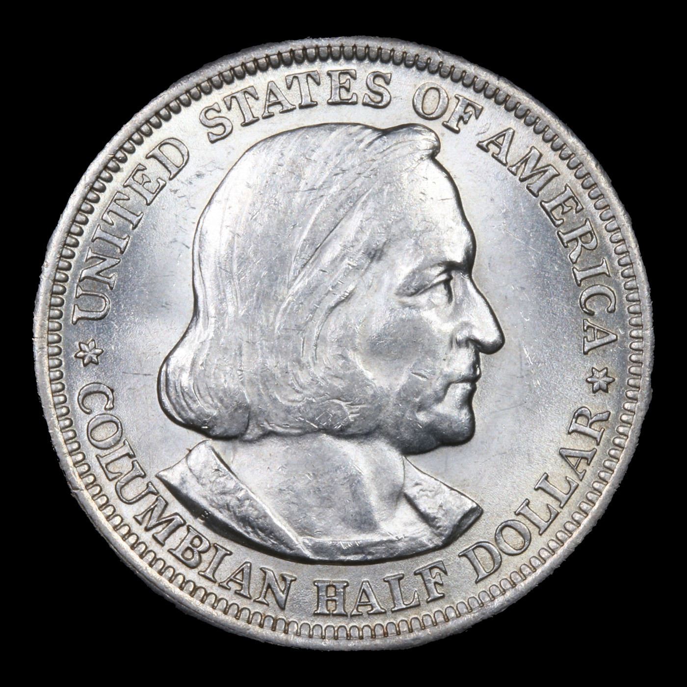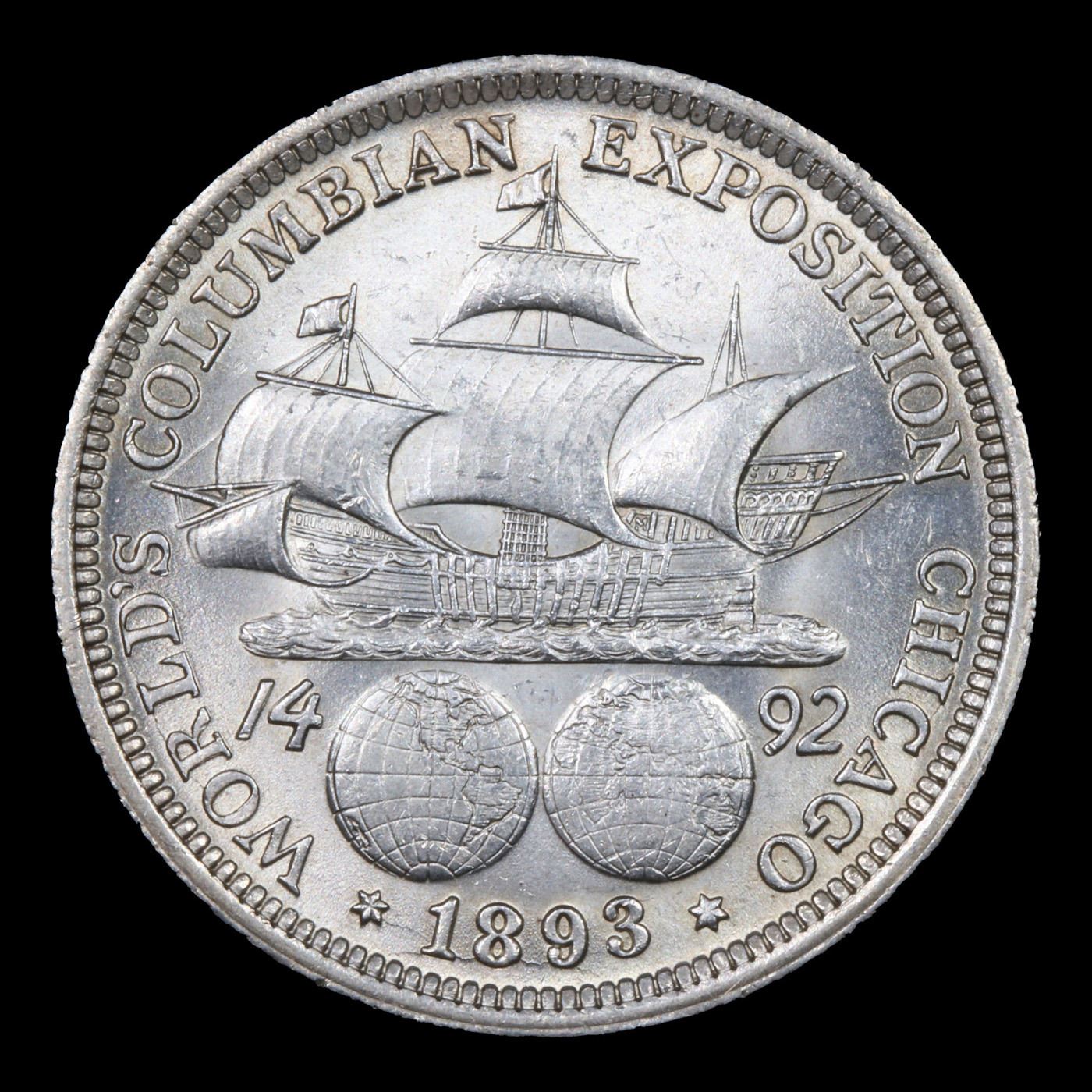 1893 Columbian Old Commem Half Dollar 50c Grades Choice+ Unc. The Columbus Half Dollar along with the Isabella Quarter were Minted in Honor of the 400th Anniversary of Columbus' Voyage to the New World. It was First Distributed at the Worlds Fair Honoring that Voyage. When examining a Columbian Exposition Half Dollar, the First Points to Show Wear are Columbus’ Eyebrow, Cheek and the Hair Behind his Forehead and Jaw. On the Reverse, Check the Foresail and Sainsail, as well as the Right Side of the Eastern Hemisphere.