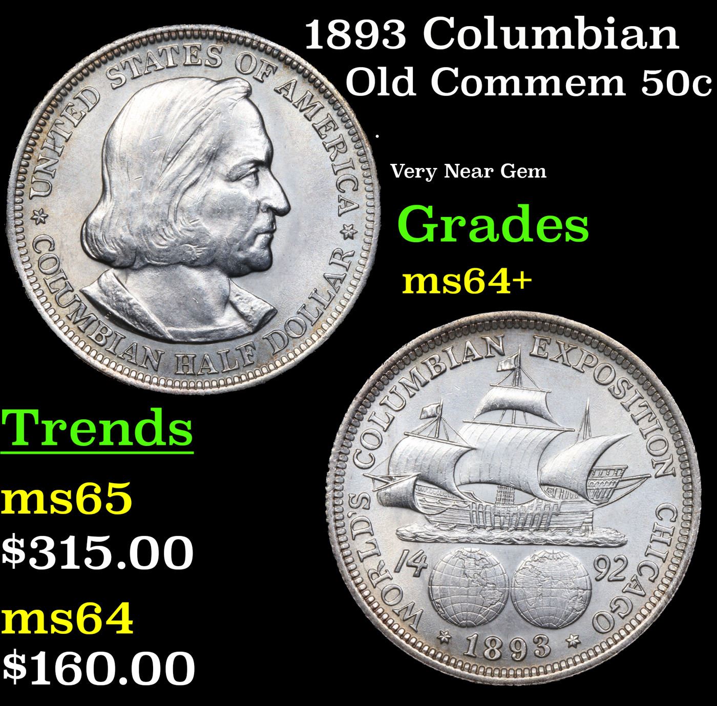 1893 Columbian Old Commem Half Dollar 50c Grades Choice+ Unc. The Columbus Half Dollar along with the Isabella Quarter were Minted in Honor of the 400th Anniversary of Columbus' Voyage to the New World. It was First Distributed at the Worlds Fair Honoring that Voyage. When examining a Columbian Exposition Half Dollar, the First Points to Show Wear are Columbus’ Eyebrow, Cheek and the Hair Behind his Forehead and Jaw. On the Reverse, Check the Foresail and Sainsail, as well as the Right Side of the Eastern Hemisphere.