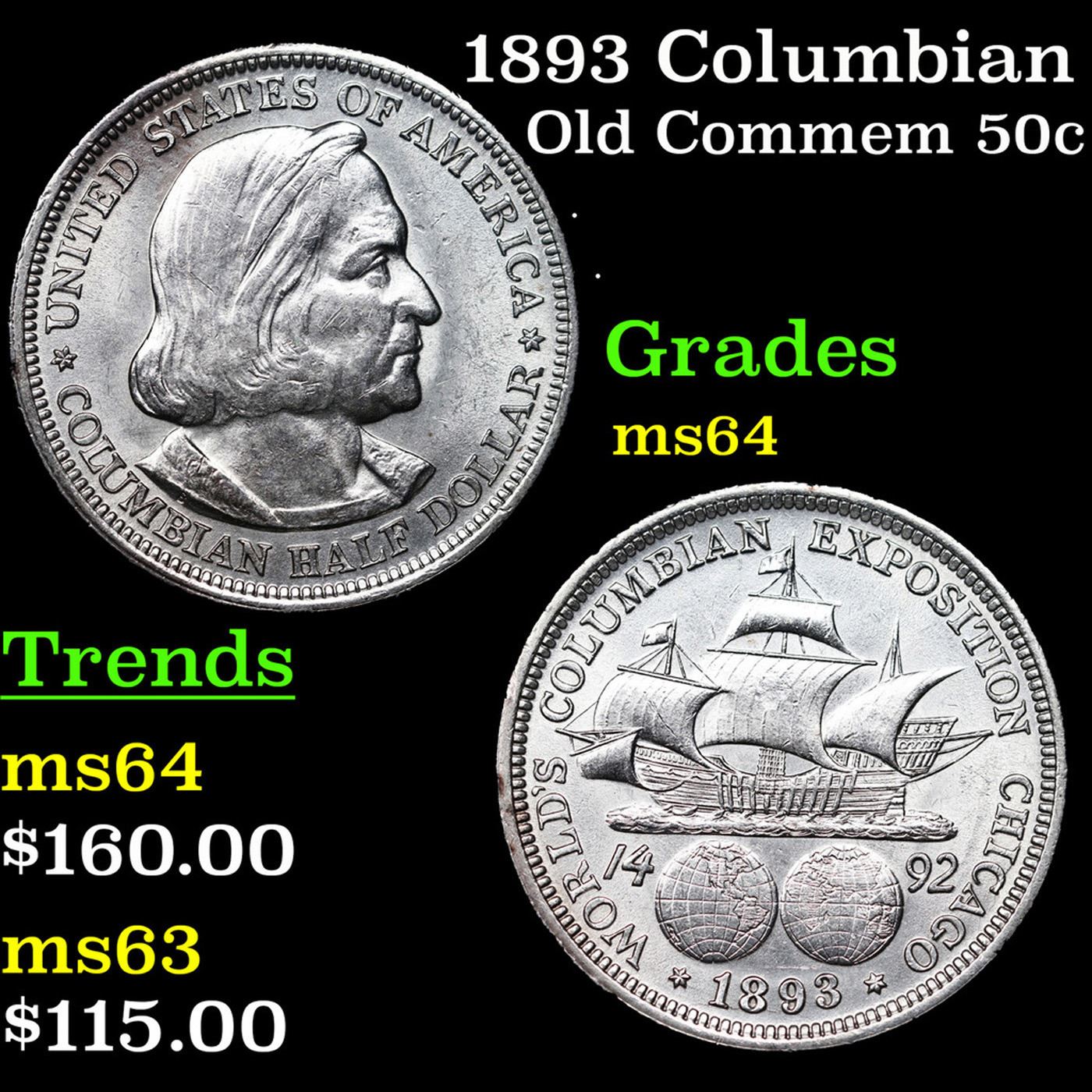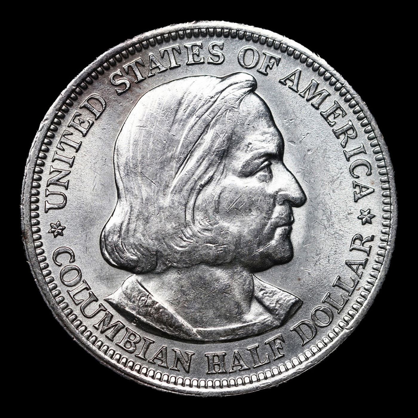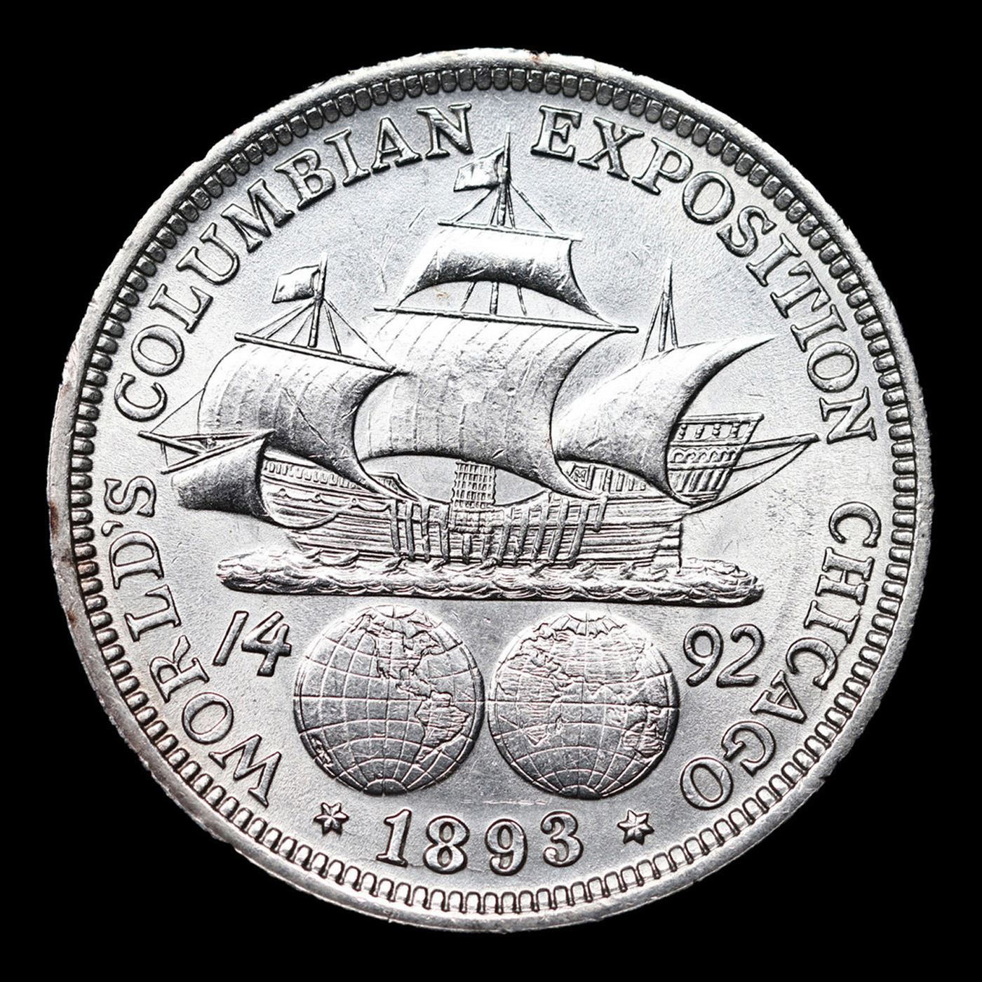 1893 Columbian Old Commem Half Dollar 50c Grades Choice Unc. The Columbus Half Dollar along with the Isabella Quarter were Minted in Honor of the 400th Anniversary of Columbus' Voyage to the New World. It was First Distributed at the Worlds Fair Honoring that Voyage. When examining a Columbian Exposition Half Dollar, the First Points to Show Wear are Columbus’ Eyebrow, Cheek and the Hair Behind his Forehead and Jaw. On the Reverse, Check the Foresail and Sainsail, as well as the Right Side of the Eastern Hemisphere.